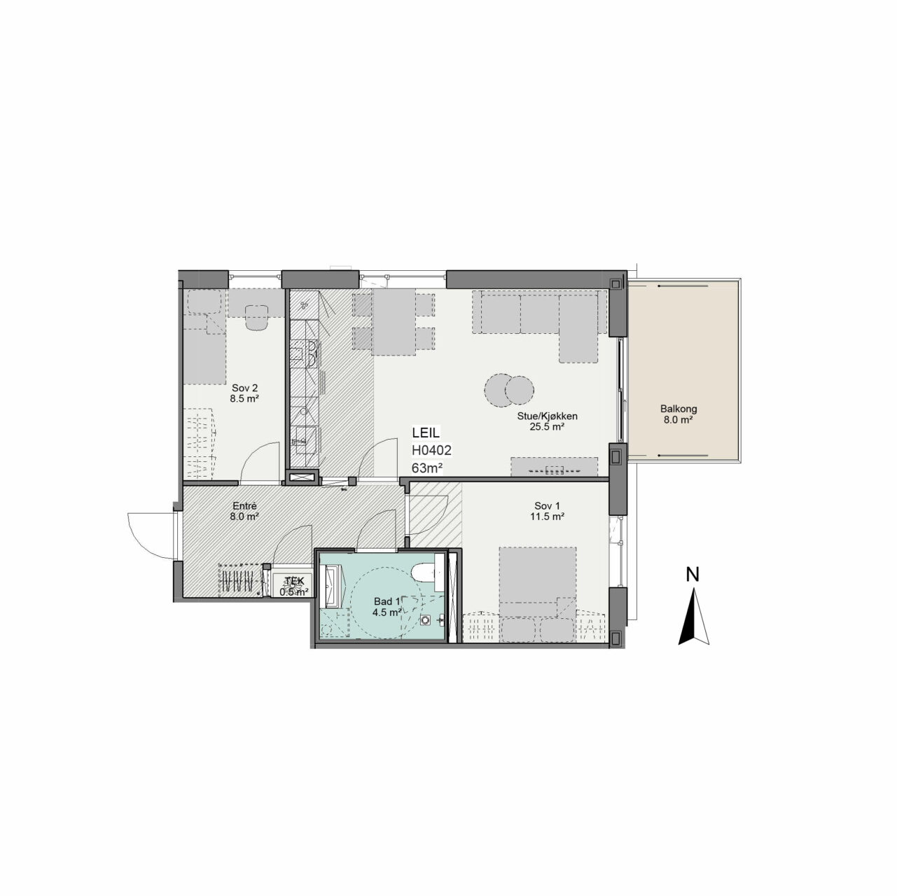 Bad leveres som typegodkjente prefabrikkerte baderomsmoduler. Se romskjema for detaljer om innredning, utstyr og overflater. Standard er grå fliser i størrelse 60 x 60 cm. I nedsenket dusjsone leveres mosaikkfliser (5×5 cm) for fall. Det er videre 2 kostnadsfrie fargevalg: lys beige og beige.
