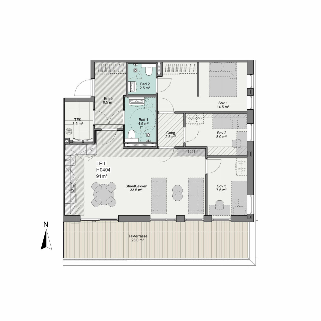 Bad leveres som typegodkjente prefabrikkerte baderomsmoduler. Se romskjema for detaljer om innredning, utstyr og overflater. Standard er grå fliser i størrelse 60 x 60 cm. I nedsenket dusjsone leveres mosaikkfliser (5×5 cm) for fall. Det er videre 2 kostnadsfrie fargevalg: lys beige og beige.