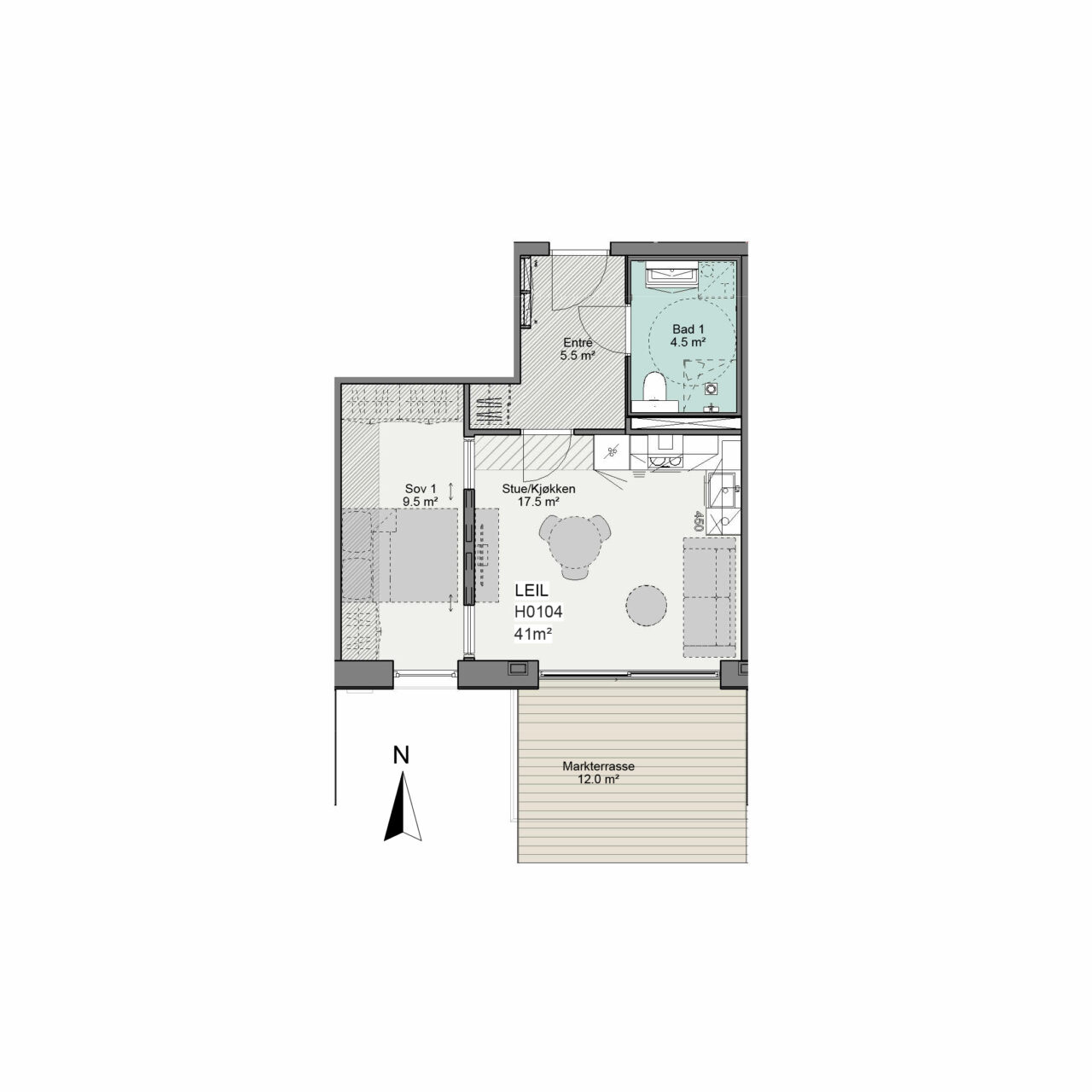 Bad leveres som typegodkjente prefabrikkerte baderomsmoduler. Se romskjema for detaljer om innredning, utstyr og overflater. Standard er grå fliser i størrelse 60 x 60 cm. I nedsenket dusjsone leveres mosaikkfliser (5×5 cm) for fall. Det er videre 2 kostnadsfrie fargevalg: lys beige og beige.