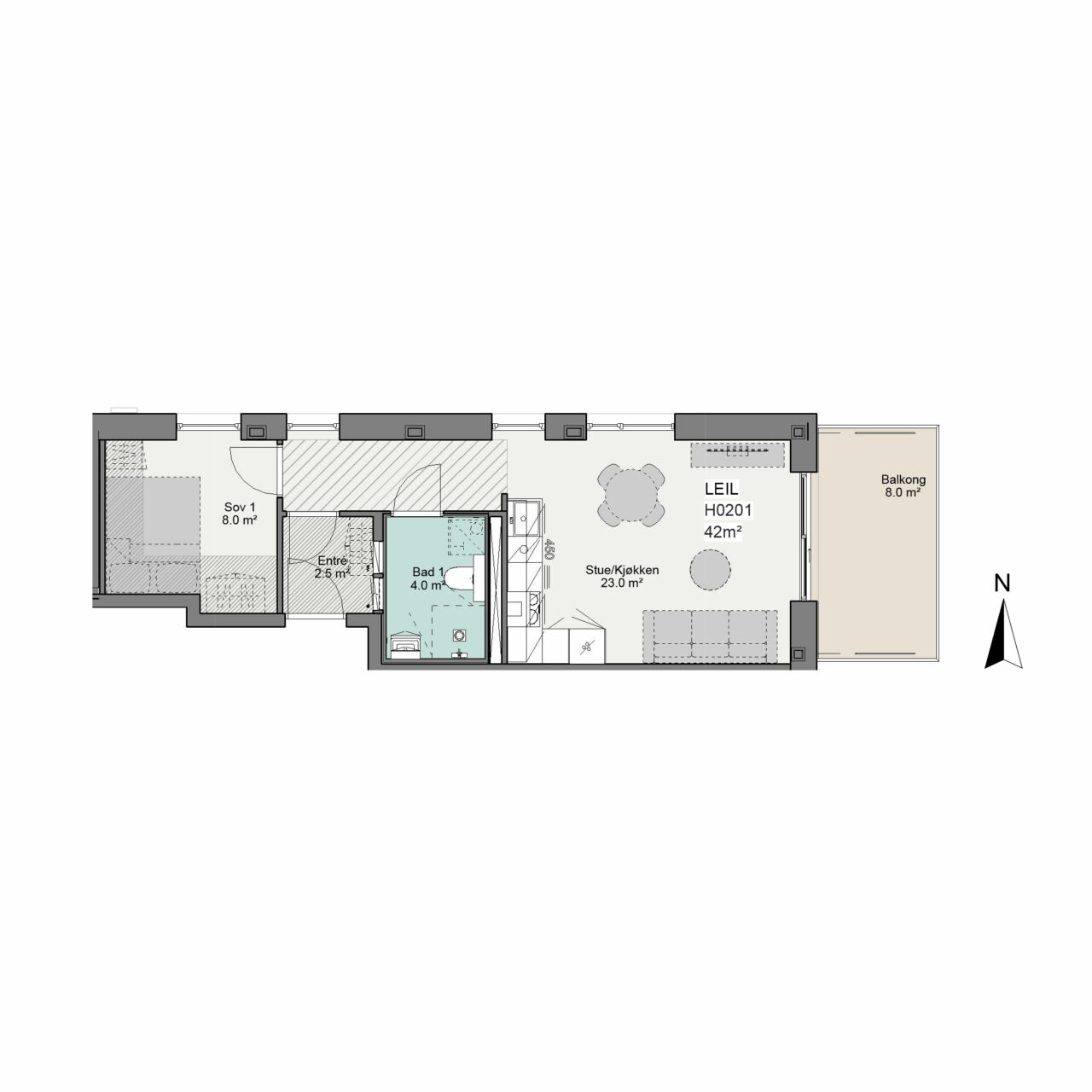 Leilighet A6-0201 er en arealeffektiv 2-roms med beliggenhet i 2. etasje. Leilighetens entré har plass til garderobeløsning. Åpen kjøkken-/stueløsning med naturlige møbleringssoner og utgang til en østvendt balkong på ca. 8 kvm. Soverom med plass til dobbeltseng og garderobeløsning. Leilighetens baderom er flislagt med delikate fliser og opplegg for vaskemaskin og tørketrommel.