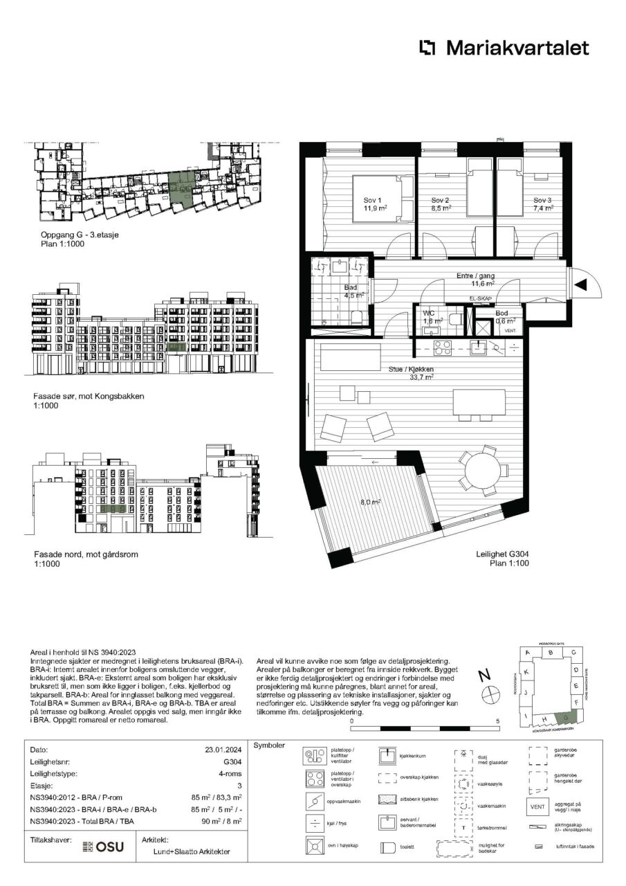 Arealet er beregnet ut fra Norsk standard NS 3940:2023. BRA-i: Internt arealet innenfor boligens omsluttende vegger, inkludert sjakt. BRA-e: Eksternt areal som boligen har eksklusiv bruksrett til, men som ikke ligger i boligen, f.eks. kjellerbod. BRA-b: Areal for innglasset balkong med veggareal. Total BRA = Summen av BRA-i, BRA-e og BRA-b. TBA er areal på terrasse og balkong. Arealet oppgis ved salg, men inngår ikke i BRA. Oppgitt romareal er netto romareal. De oppgitte arealer er å betrakte som cirka-arealer. Partene har ingen krav mot hverandre dersom arealet skulle vise seg å være 5 % mindre / større enn det oppgitte areal.