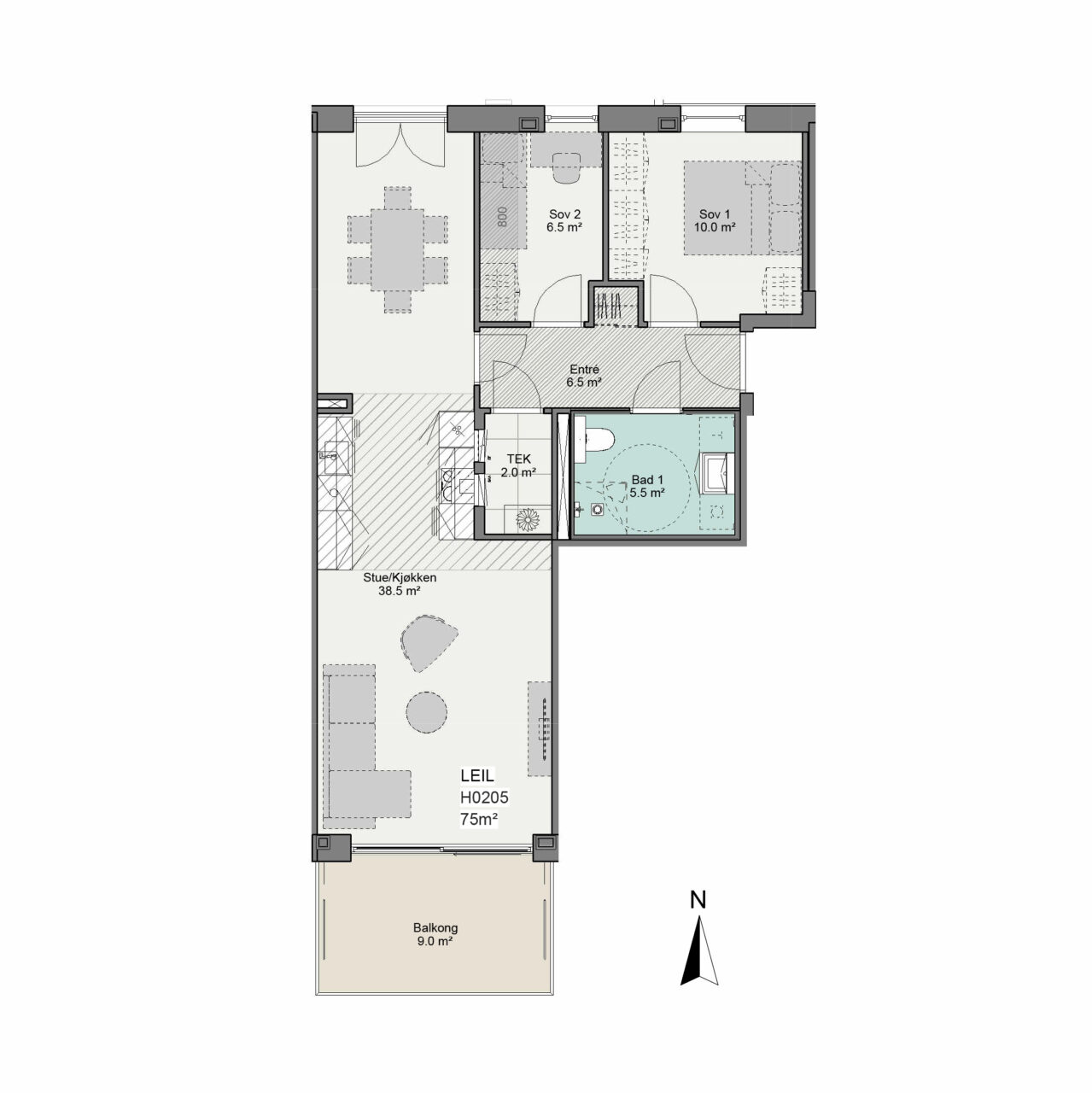 Bad leveres som typegodkjente prefabrikkerte baderomsmoduler. Se romskjema for detaljer om innredning, utstyr og overflater. Standard er grå fliser i størrelse 60 x 60 cm. I nedsenket dusjsone leveres mosaikkfliser (5×5 cm) for fall. Det er videre 2 kostnadsfrie fargevalg: lys beige og beige.