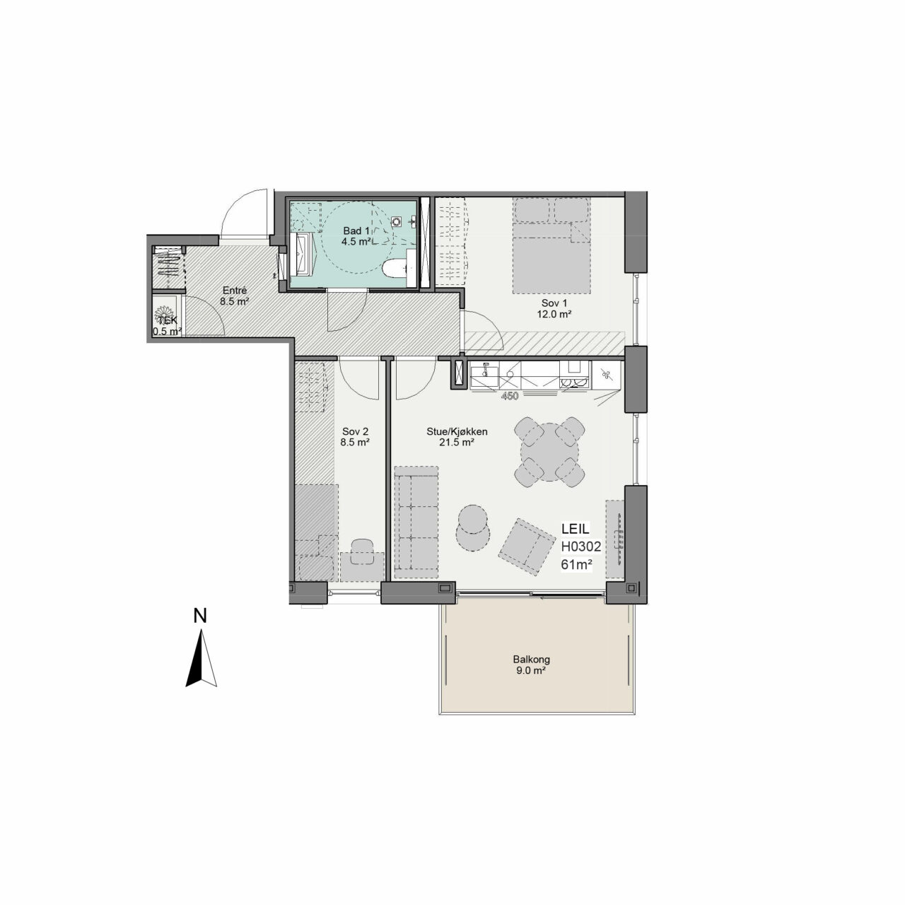 Det leveres kjøkken fra HTH eller Sigdal med integrerte hvitevarer fra Bosch eller tilsvarende. I forbindelse med tilvalg vil det bli utarbeidet egne kjøkkentegninger fra leverandør med mulighet for individuelle tilpasninger (fronter, benkeplate m.m.) mot pristillegg. Plassering av ventilator, koketopp og vask kan ikke endres.