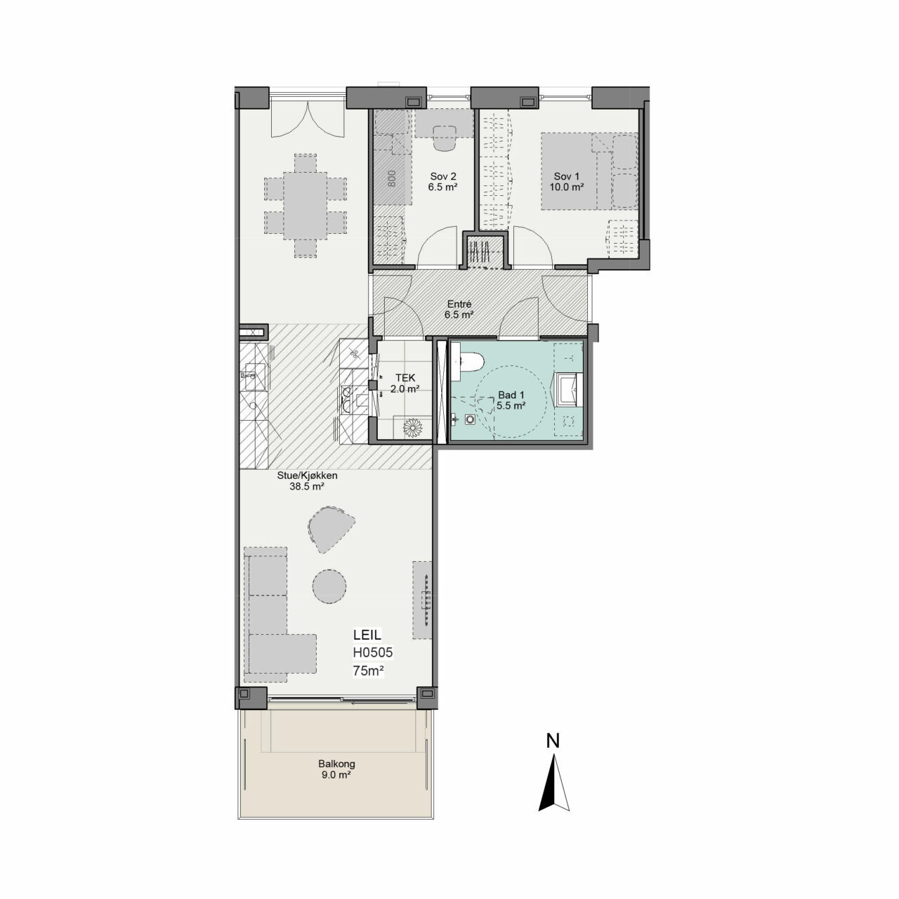 Bad leveres som typegodkjente prefabrikkerte baderomsmoduler. Se romskjema for detaljer om innredning, utstyr og overflater. Standard er grå fliser i størrelse 60 x 60 cm. I nedsenket dusjsone leveres mosaikkfliser (5×5 cm) for fall. Det er videre 2 kostnadsfrie fargevalg: lys beige og beige.