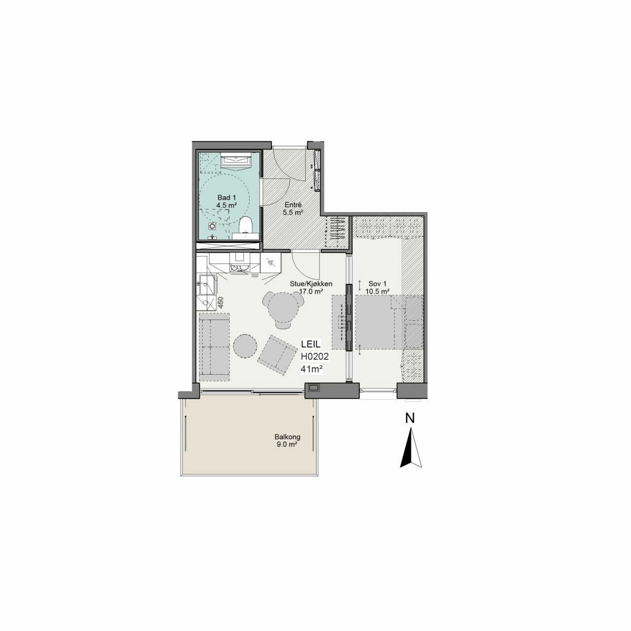 Bad leveres som typegodkjente prefabrikkerte baderomsmoduler. Se romskjema for detaljer om innredning, utstyr og overflater. Standard er grå fliser i størrelse 60 x 60 cm. I nedsenket dusjsone leveres mosaikkfliser (5×5 cm) for fall. Det er videre 2 kostnadsfrie fargevalg: lys beige og beige.