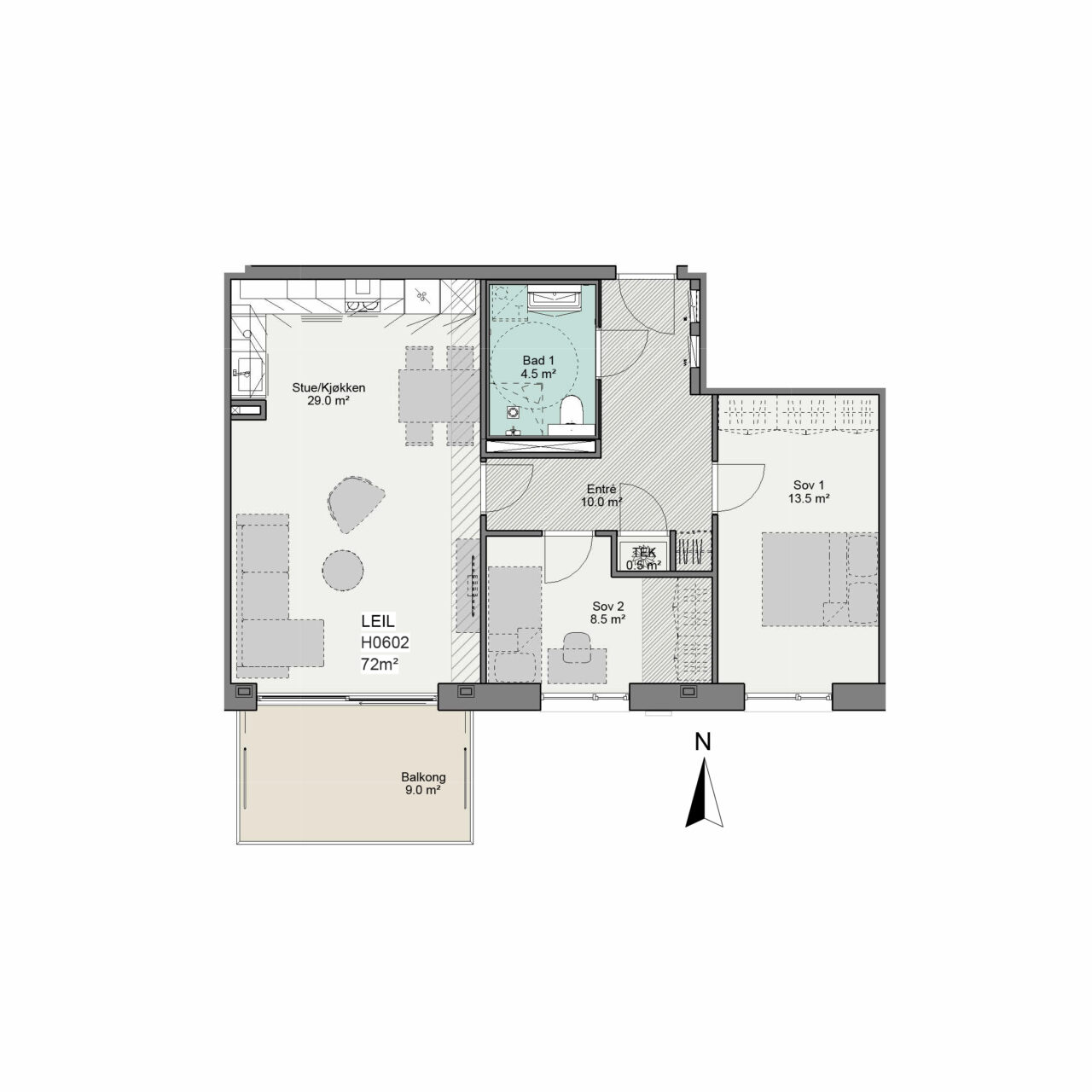 Bad leveres som typegodkjente prefabrikkerte baderomsmoduler. Se romskjema for detaljer om innredning, utstyr og overflater. Standard er grå fliser i størrelse 60 x 60 cm. I nedsenket dusjsone leveres mosaikkfliser (5×5 cm) for fall. Det er videre 2 kostnadsfrie fargevalg: lys beige og beige.