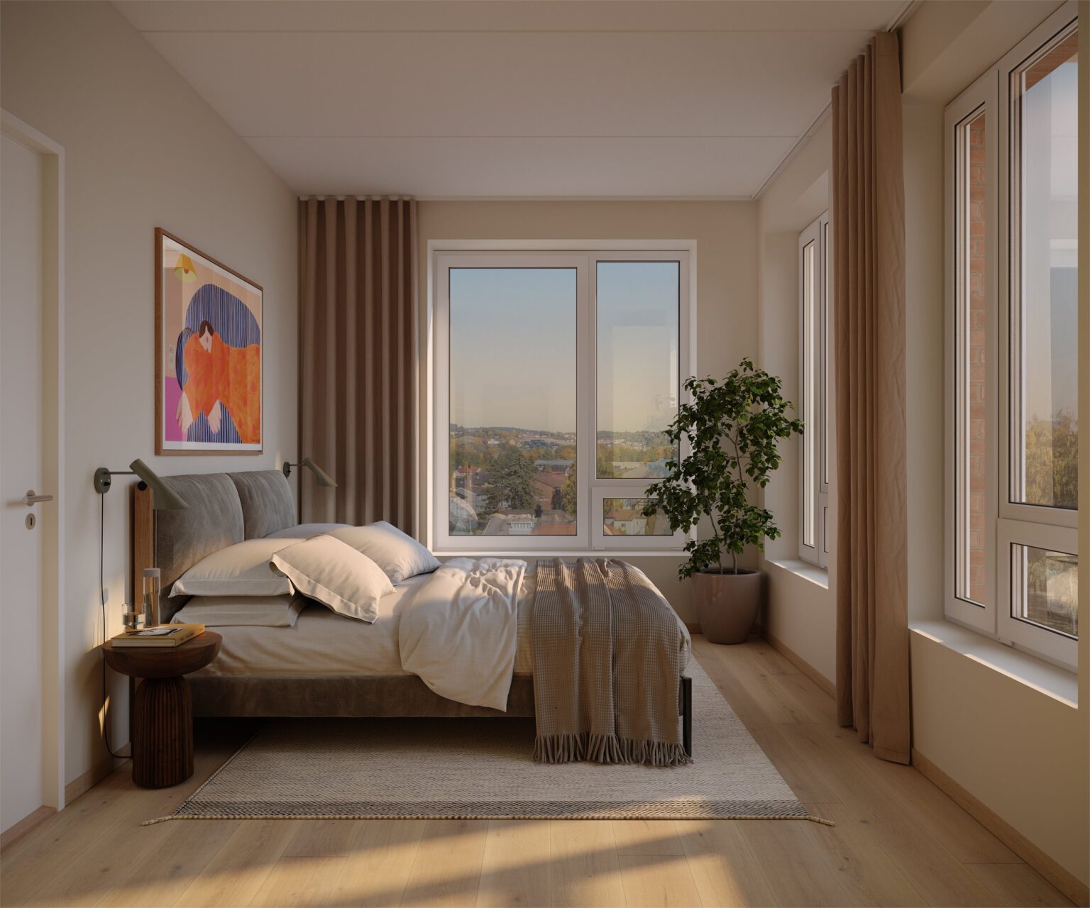 Vannbåren gulvvarme gir jevn og behagelig oppvarming, samtidig som det skaper et bedre inneklima og et stilrent uttrykk uten synlige radiatorer. Kjøkkenet leveres med sømløst integrerte hvitevarer, inkludert en selvrensende stekeovn for enkel rengjøring. De større leilighetene har vinduer både mot gaten og den grønne kvartalshagen, med stue og kjøkken i ett gjennomgående, åpent og luftig rom. Toppetasjene i lamellbygget mot Teatergata vil få en ekstra romfølelse med saltak og god takhøyde. Alle leilighetene vil få egen uteplass enten som balkong eller terrasse.