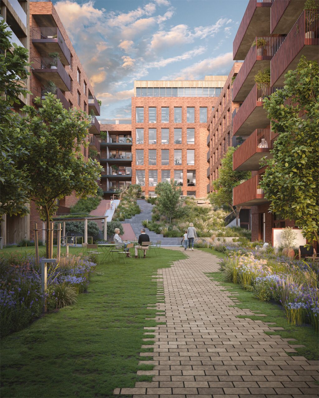 Det er også tenkt på bærekraft. Gårdsrommet er plantet med lokale vekster som absorberer overvann og gir et frodig utseende. Takene blir grønne og de blir både miljøvennlige og pene å se på. Sykkelparkering finnes overalt, så det er enkelt å bruke sykkel i hverdagen.