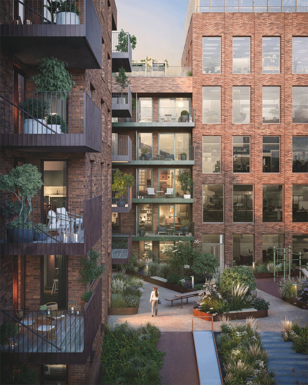 Kvartalshagen passer for alle og har flere soner for lek, avslapning og sosialt samvær. Uteområdene er designet for bruk hele året, med beplantning som endrer seg med årstidene og skaper et godt miljø.