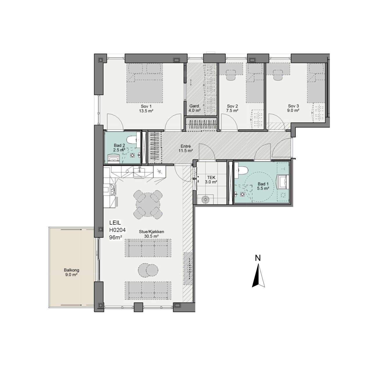 Bad leveres som typegodkjente prefabrikkerte baderomsmoduler. Se romskjema for detaljer om innredning, utstyr og overflater. Standard er grå fliser i størrelse 60 x 60 cm. I nedsenket dusjsone leveres mosaikkfliser (5×5 cm) for fall. Det er videre 2 kostnadsfrie fargevalg: lys beige og beige.
