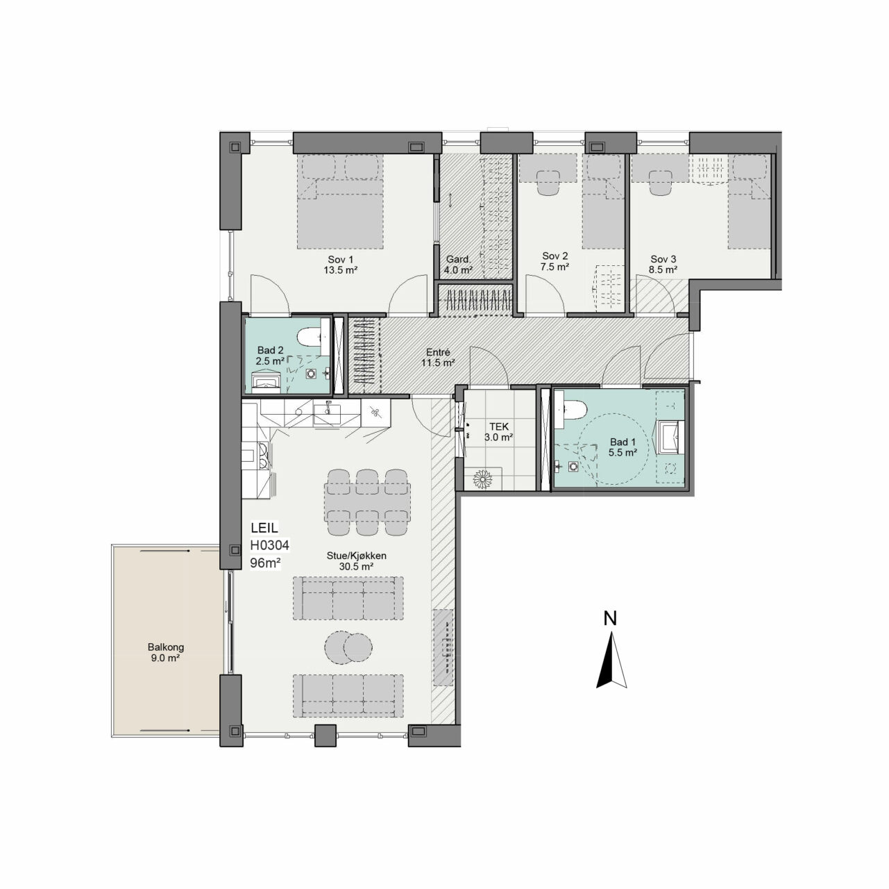 Bad leveres som typegodkjente prefabrikkerte baderomsmoduler. Se romskjema for detaljer om innredning, utstyr og overflater. Standard er grå fliser i størrelse 60 x 60 cm. I nedsenket dusjsone leveres mosaikkfliser (5×5 cm) for fall. Det er videre 2 kostnadsfrie fargevalg: lys beige og beige.
