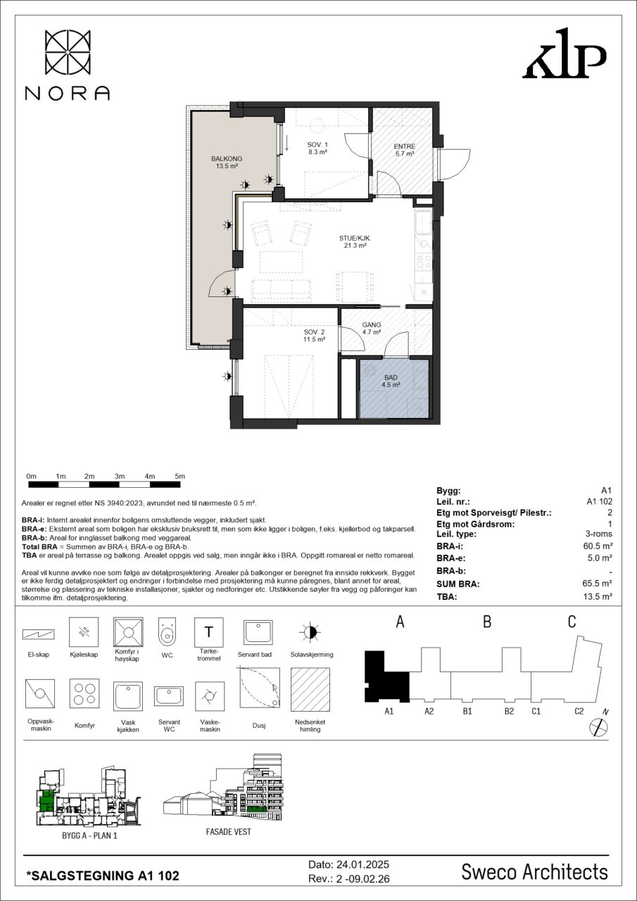 Arealet er beregnet ut fra Norsk standard NS 3940:2023. BRA-i: Internt arealet innenfor boligens omsluttende vegger, inkludert sjakt. BRA-e: Eksternt areal som boligen har eksklusiv bruksrett til, men som ikke ligger i boligen, f.eks. kjellerbod. BRA-b: Areal for innglasset balkong med veggareal. Total BRA = Summen av BRA-i, BRA-e og BRA-b. TBA er areal på terrasse og balkong. Arealet oppgis ved salg, men inngår ikke i BRA. Oppgitt romareal er netto romareal. De oppgitte arealer er å betrakte som cirka-arealer. Partene har ingen krav mot hverandre dersom arealet skulle vise seg å være 5 % mindre / større enn det oppgitte areal.