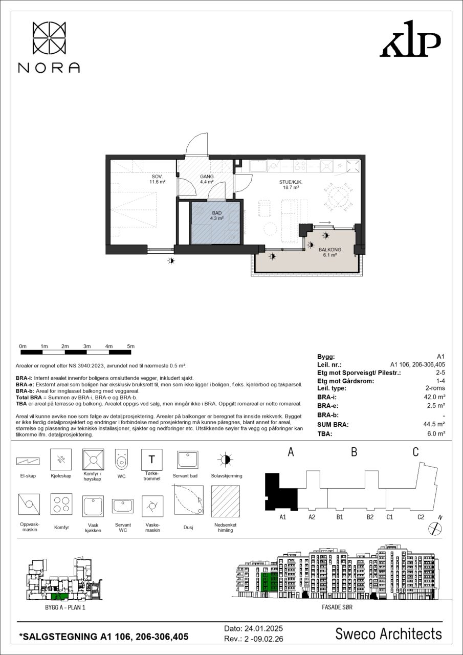 Leilighet A1 106 er en smart og effektiv 2-roms leilighet beliggende i tilsvarende 2. etasje fra Sporveisgata. Leiligheten inneholder entré med plass til en garderobeskap. Videre har man en åpen stue- kjøkkenløsning med et stort kjøkken. Kjøkkenet leveres fra HTH og har godt med skap- og benkeplass. Det leveres også hvitevarer på kjøkken. Leiligheten har et delikat, flislagt baderom med gulvvarme, wc, dusjhjørne og servant med underskap. På badet har man også plass til vaskemaskin og tørketrommel i søyle. Leilighetens soverom er av god størrelse med god plass til garderobeløsning og dobbeltseng. Fra stuen har man tilgang til balkong.