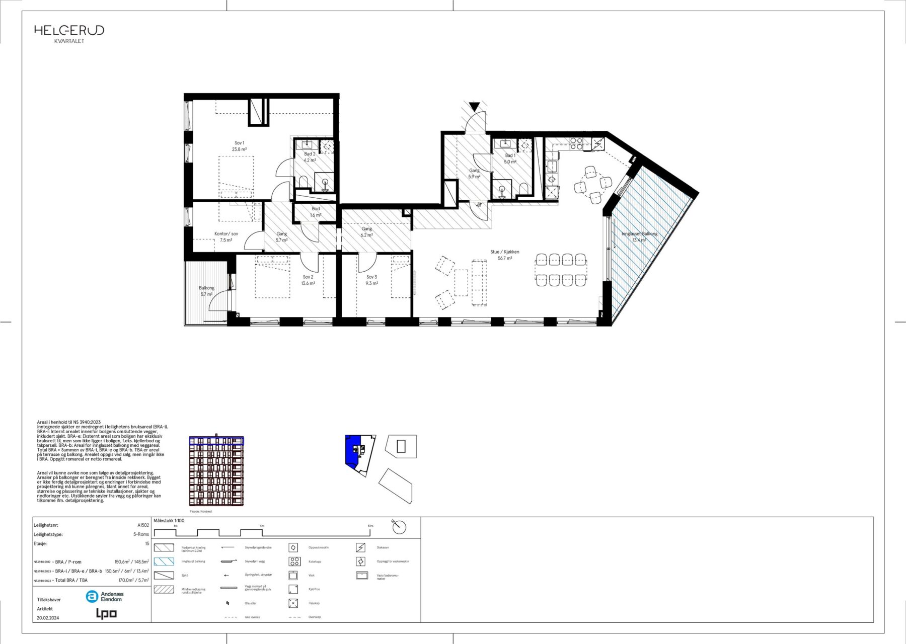 Fra sjette etasje og oppover blir det boliger, og en leilighet i første ligger egentlig i sjette, for å gi det et lettfattelig bilde. Dette gjør at alle leilighetene i Helgerudkvartalet får lys og luft, høyt hevet over bakkeplanet. Øverst i to av byggene, i 14. etasje, blir det felles takterrasser hvor alt er tilrettelagt for å kunne invitere venner og kjente til et imponerende måltid. Utsikten du får her er det ingen andre i Sandvika som har hatt før deg. Det er ytterst sjelden ordet «unikt» er berettiget å bruke. Dette er en av de få gangene det faktisk er det. Det blir 6 «frittstående» boligbygg på taket av 2 fem etasjes næringsbygg. Boligbyggene er fra 6 til 10 etasjer høye, til sammen fra 11 til 15 etasjer over bakkeplan. I sjette etasje blir det felles takhager for boligene, anlagt på taket av kontorlokalene i femte.