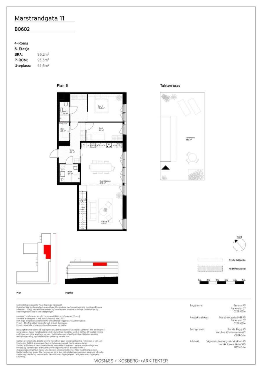 Takkonstruksjonen isoleres og dimensjoneres i henhold til energiberegninger. Det legges taktekking med forskriftsmessig fall til sluk. For de leilighetene som får takterrasser vil det legges tremmegulv, som angitt på kontraktstegning.