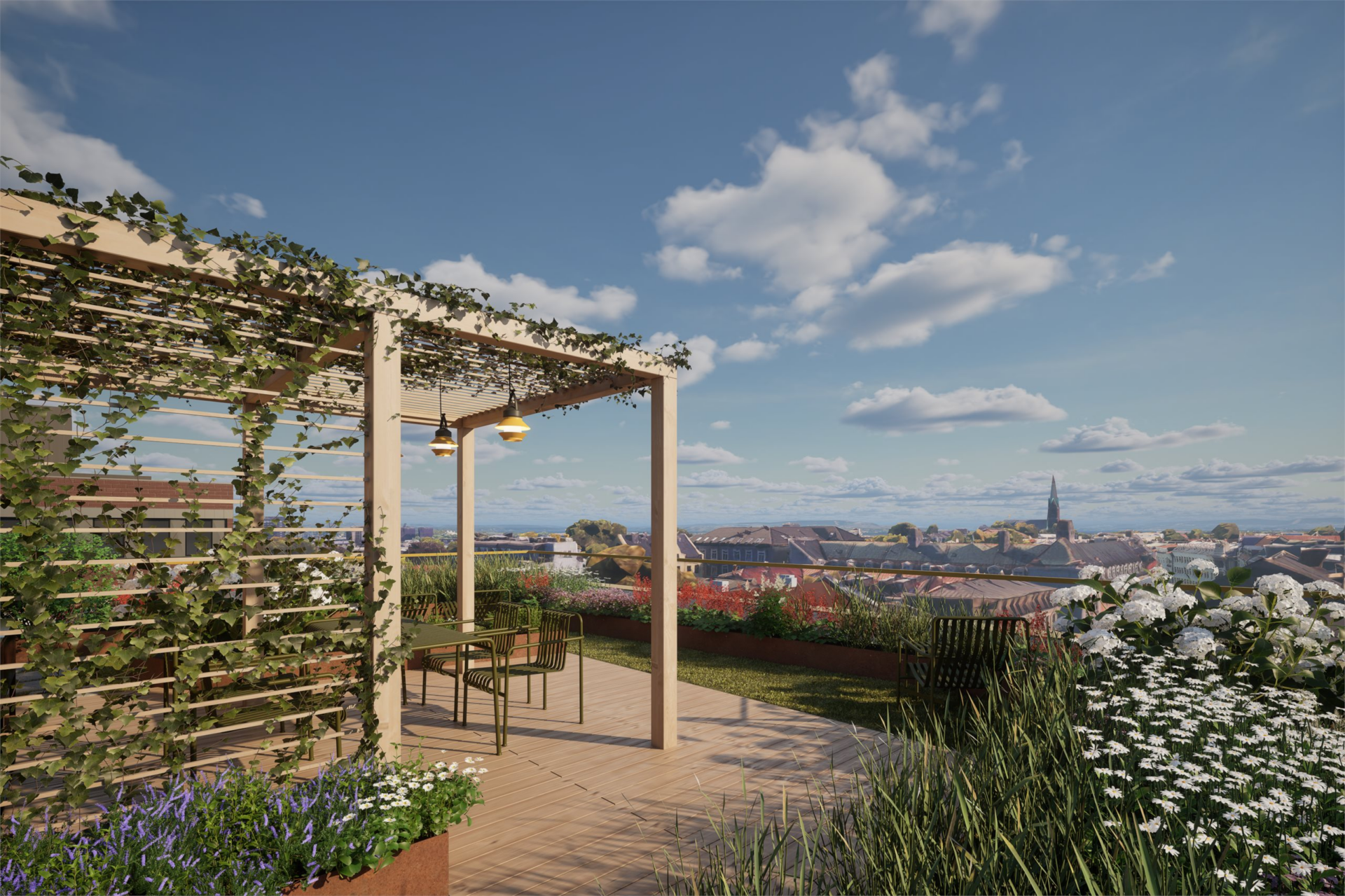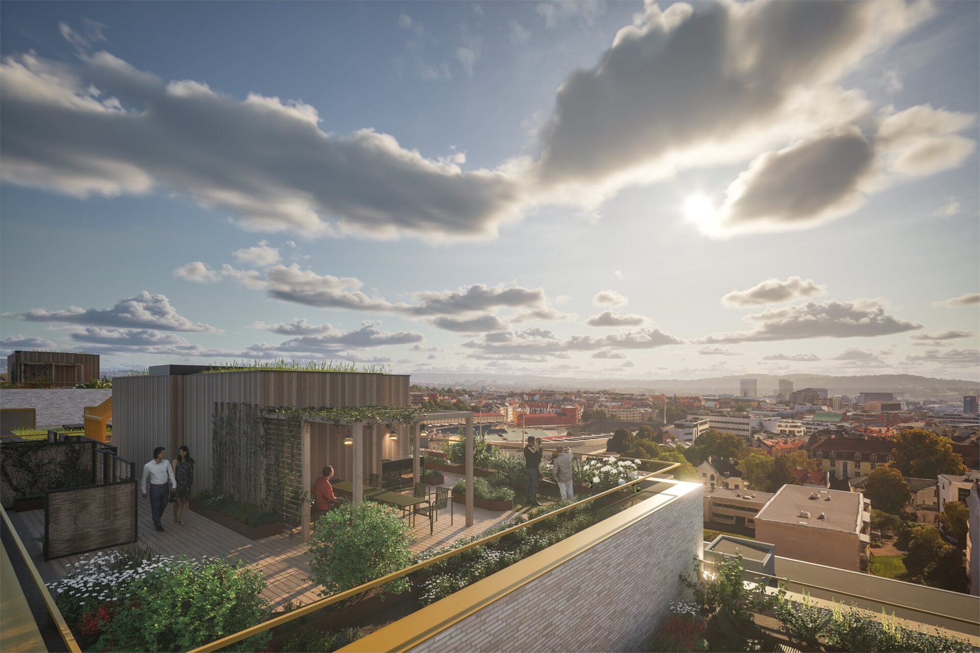 Det legges opp til at hver oppgang har tilgang på en takhage med ulikt innhold som sittegrupper under pergolaer, utekjøkken, drivhus og områder for soling og avslapning. Det er høy andel av vegetasjon på takene som er med på å skjerme de ulike oppholdssonene, håndtere overvannet, og øke biologisk mangfold.