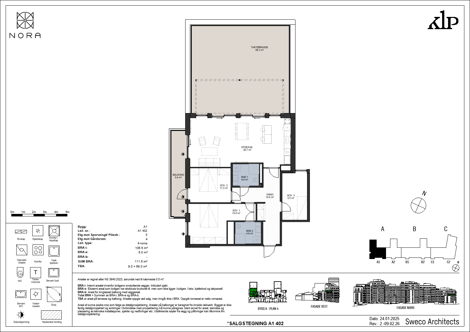 Leilighet A1 402 i NORA er en av prosjektets unike 4-roms front-/hjørneleilighet med stor, privat uteplass. Leiligheten er plassert i en av prosjektets «fløyer» med beliggenhet mot rolig bakgård. Leiligheten har romslig entré med plass til garderobe. Fra entré har man også tilgang til leilighetens tre soverom, samt baderom 2. Hovedsoverommet er av god størrelse og har plass til dobbeltseng og garderobeløsning. Her har man også eget baderom en-suite. Leilighetens soverom 2 har plass til dobbeltseng og garderobeskap, mens soverom 3 passet utmerket som barnerom/gjesterom/kontor. Videre har man en romslig stue-/kjøkkenløsning på 39 kvm med egne soner for både spisebord og sofagruppe. Leilighet A1 402 har et lekkert kjøkken fra HTH som leveres med kjøkkenøy. Her har man god skapplass og rikelig med plass på kjøkkenbenk, samt øy for kokkelering. Baderommene er lekkert flislagt, og inneholder wc, dusjhjørne, servant med underskap, speil og opplegg til vask/tørk.