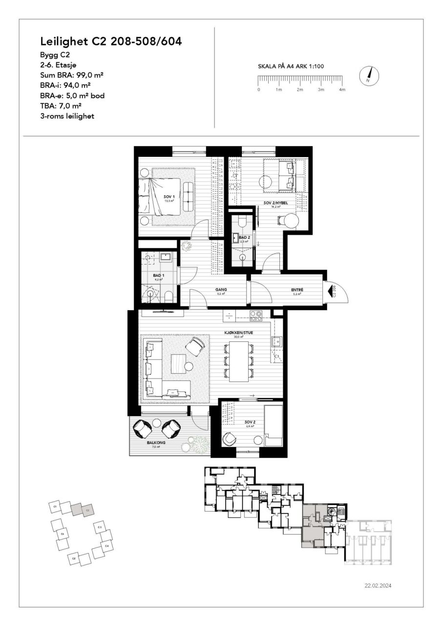 C2-604 er en gjennomgående 4-roms leilighet beliggende i 6. etasje med mulighet for hybel. Leiligheten inneholder entré med adkomst til evt. hybel med bad. Videre er det en åpen stue-/kjøkkenløsning med utgang til sydvendt balkong på ca. 7 kvm. Leiligheten har også to soverom, i tillegg til hybel.