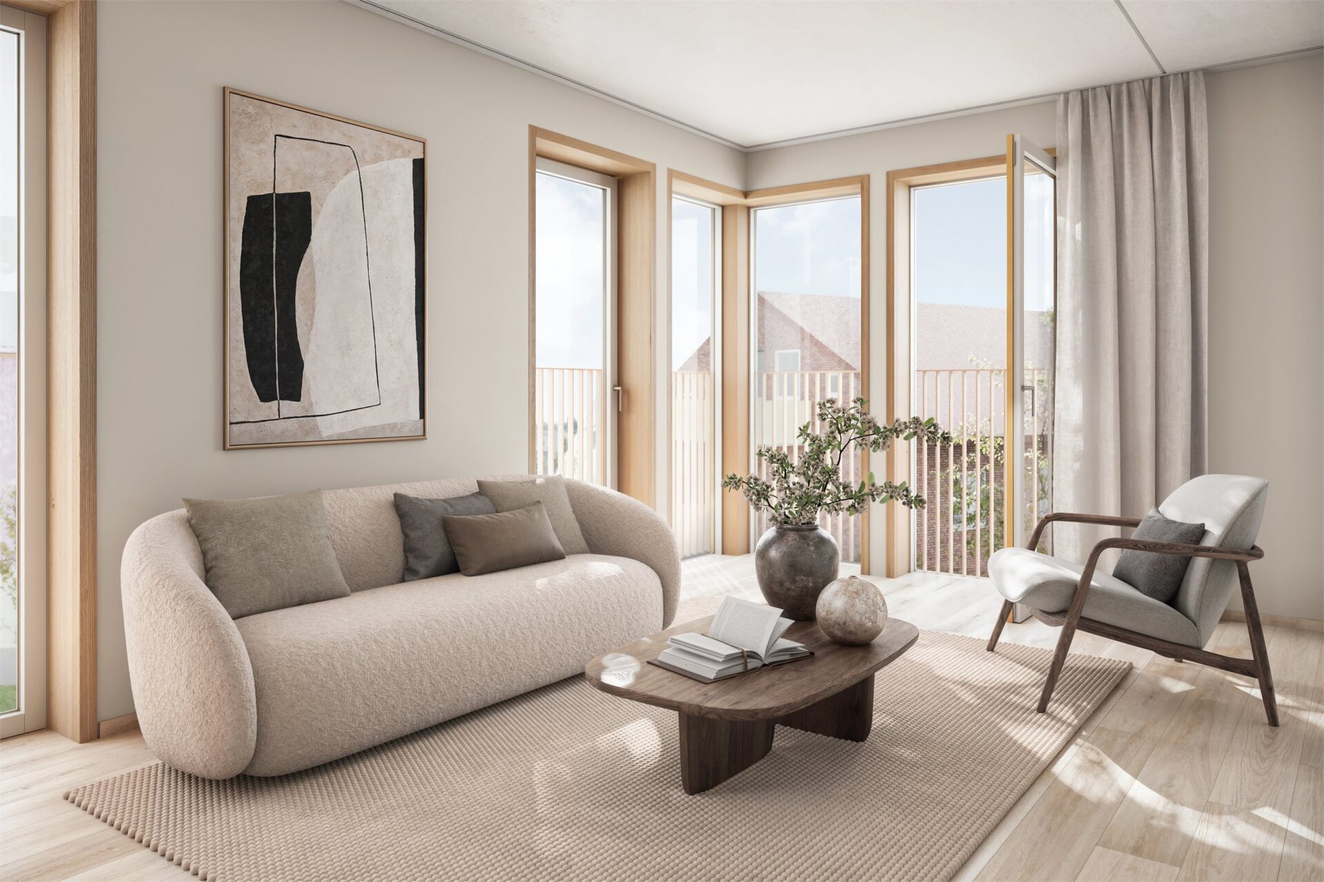 Utvendig leveres franske balkongdører og vinduer i farge etter arkitektens valg, tilpasset øvrige farger og materialiteter i fasaden. Innvendig leveres franske balkongdører og vinduer malt i NCS farge etter arkitektens valg, tilpasset øvrige fargevalg. Franske balkongdører og vinduer med foringer i laminert eik.