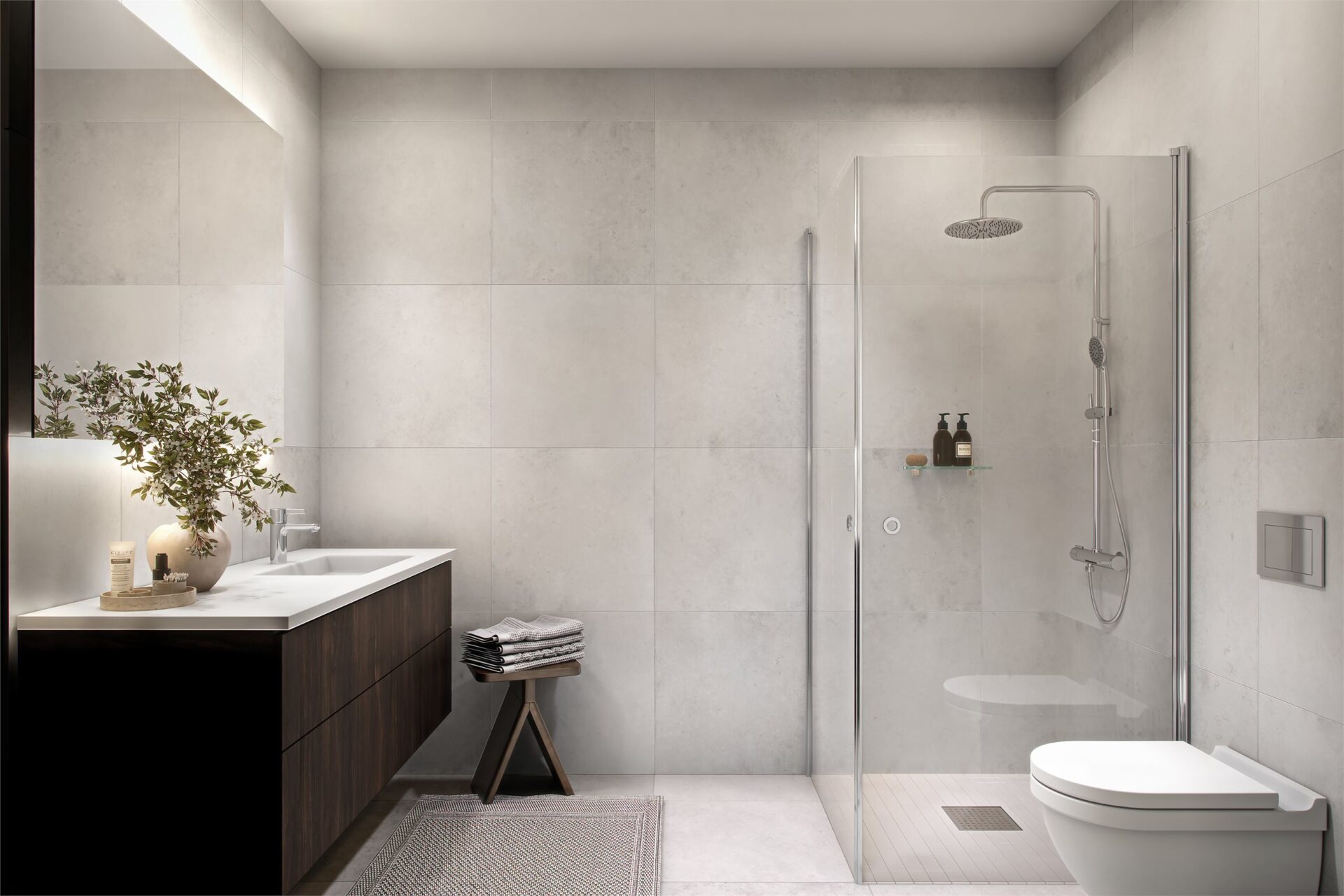 Lekre baderom leveres iht. valgt interiørkonsept. Delikate fliser i 60×60 cm og mosaikk i dusjsonen, dusjdører i glass som kan foldes, speil med belysning og downlights i tak.