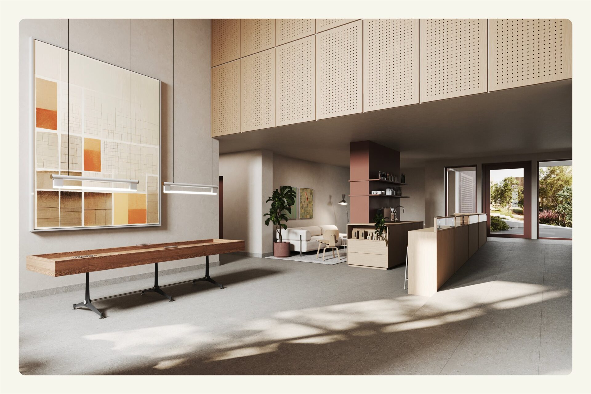 I tillegg til egne delarealer har du som beboer i Studio Poulsson gleden av flere fellesarealer og fasiliteter, som legger til rette for bokvalitet og godt naboskap. Det legges ekstra vekt på innbydende og rause inngangspartiermed både sosiale soner og shuffleboard. Du vil finne kontorhub som kan brukes som hjemmekontor og et selskapslokale du kan leie til sosiale sammenkomster. Du får også tilgang til fasiliteter som treningsrom og golfsimulator, så du kan finne formen hjemme. Enten du vil løfte vekter, løpe en tur eller utfordre deg selv på virtuelle golfbaner, får du en aktiv hverdag uten å forlate Poulssons Kvarter.