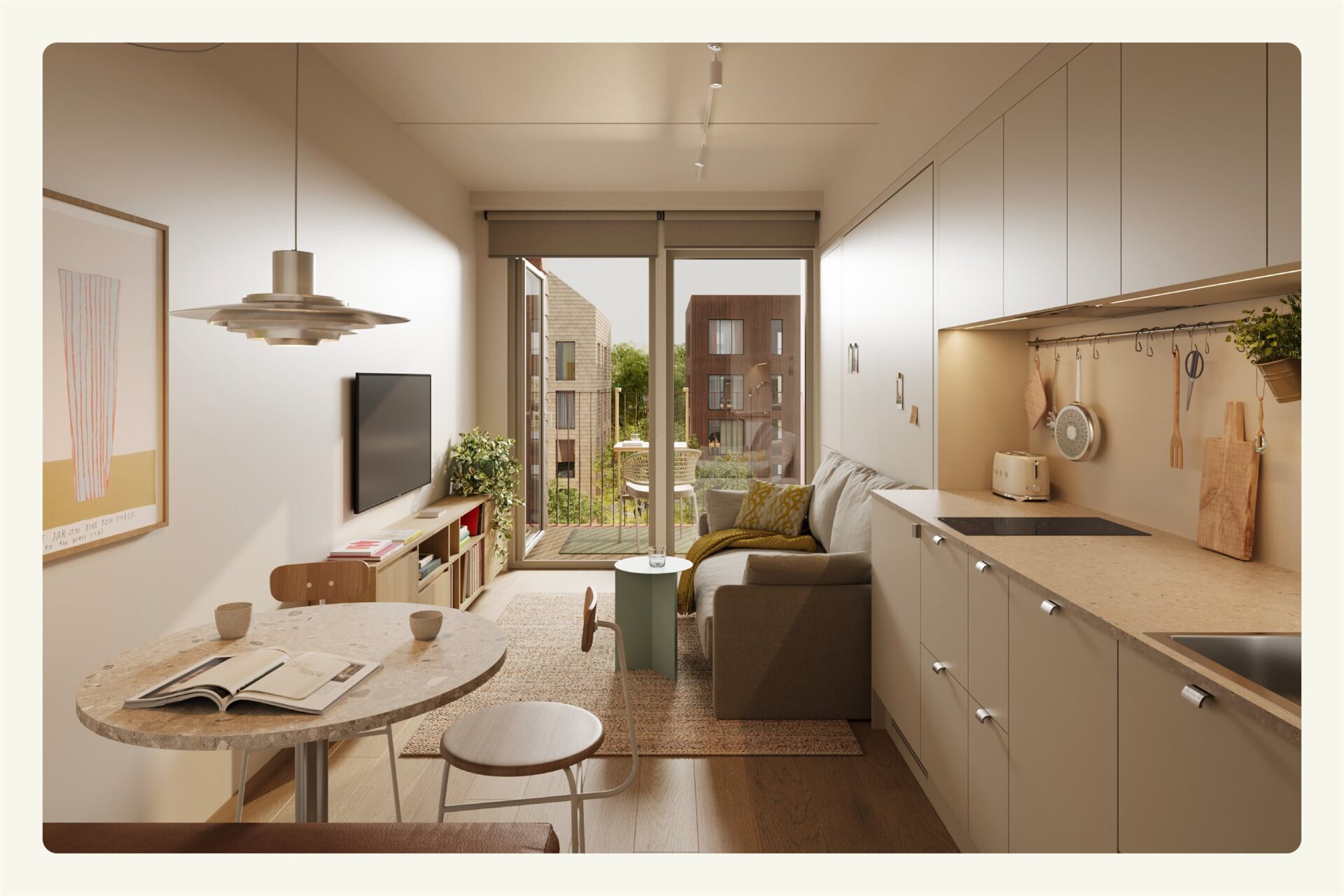 Studio Poulsson består av komplette 1-roms leiligheter på 20 til 25 m² med privat kjøkken/stue, bad og uteplass. Hver leilighet er utformet med smarte løsninger som utnytter arealet effektivt, samtidig som tilhørende delearealer gir deg ekstra rom når behovet oppstår. Resultatet er et selvstendig hjem med tilgang til mer – i et levende bomiljø i Poulssons Kvarter.