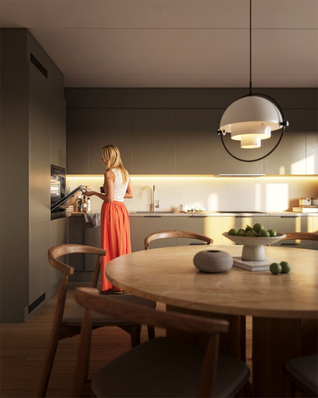 Paletten i interiøret er inspirert av den nordiske naturen, med lyse og duse jordfarger som skaper en tidløs og behagelig atmosfære – typisk for skandinavisk interiørdesign. Veggene i entre, gang, stue og kjøkken leveres i fargen Kalk, en lys gråbeige tone med et hint av rødt som gir en lun og innbydende følelse. Kjøkkenet leveres av HTH i fargen Leire som harmonerer godt med de øvrige fargene. Videre leveres det integrerte hvitevarer fra Miele.