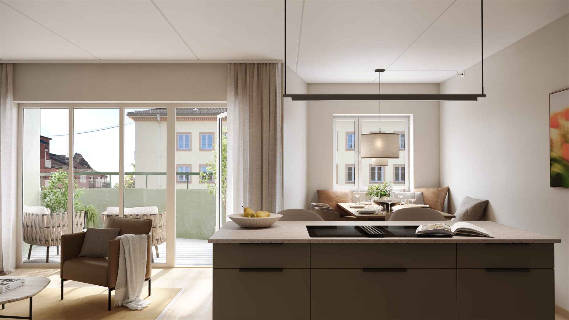 Videre er det en åpen stue- kjøkkenløsning med kjøkkenøy, og ellers god plass for både spisebord og sofagruppe. Det leveres et moderne kjøkken fra HTH med integrerte hvitevarer fra anerkjente Miele. Fra stuen har man utgang til vestvendt balkong på ca. 9 kvm med flotte solforhold.