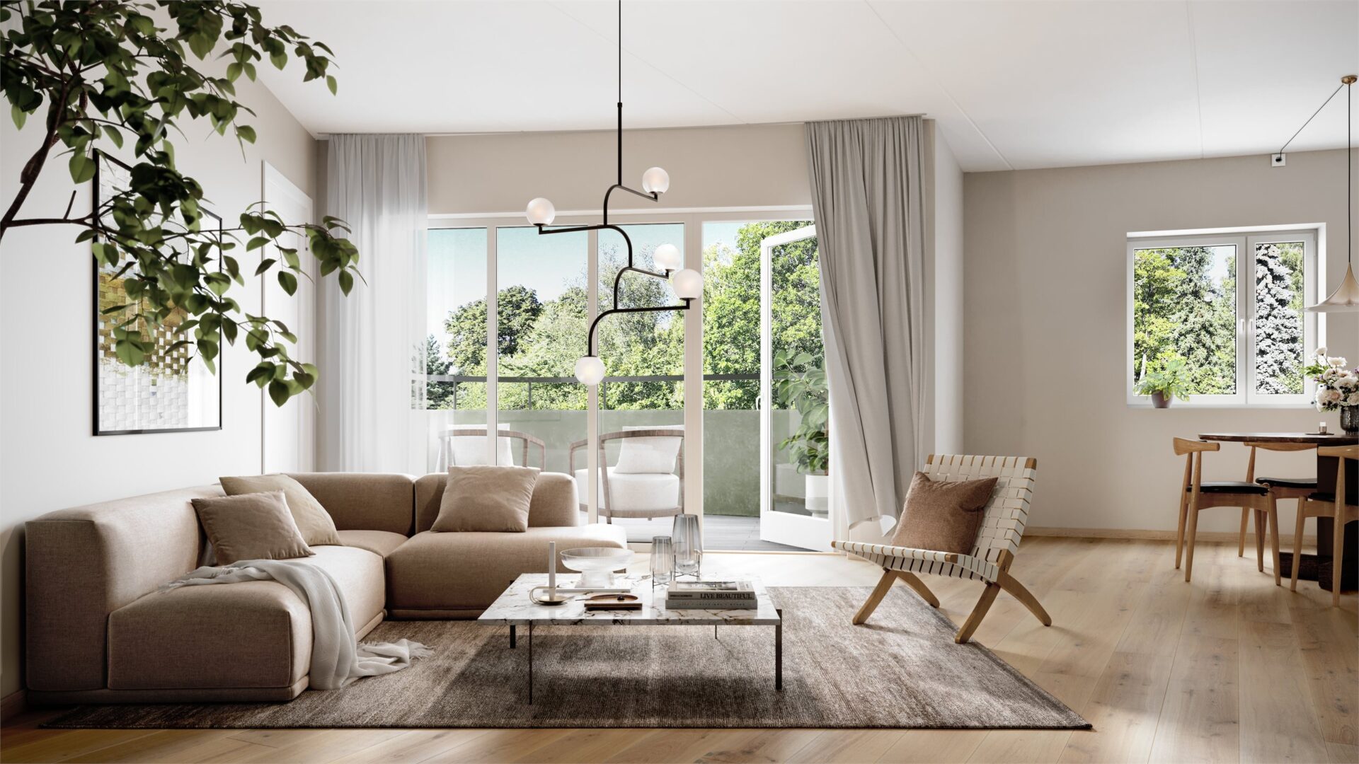 Paletten i interiøret er inspirert av den nordiske naturen, med lyse og duse jordfarger som skaper en tidløs og behagelig atmosfære – typisk for skandinavisk interiørdesign. Veggene i entre, gang, stue og kjøkken leveres i fargen Kalk, en lys gråbeige tone med et hint av rødt som gir en lun og innbydende følelse. Kjøkkenet leveres av HTH i fargen Leire som harmonerer godt med de øvrige fargene. Videre leveres det integrerte hvitevarer fra Miele.