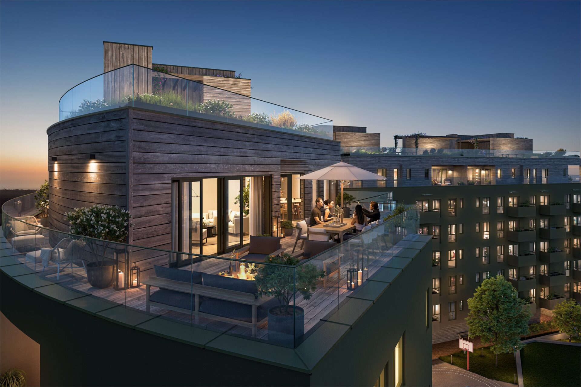 Uteområdene er utformet med tanke på bred soneinndeling. Bakgården er utformet med en liten aktivitetsplass og en sansehage, mens takterrassen har soner med utekjøkken, treningsapparater, dyrking og godt med sitteplasser. Fra den frodige takhagen har du utsikt nedover Fagerborg og mot Oslofjorden. Dette er et sted hvor du kan samle gode venner, eller trekke deg tilbake helt alene og nyte utsikten.