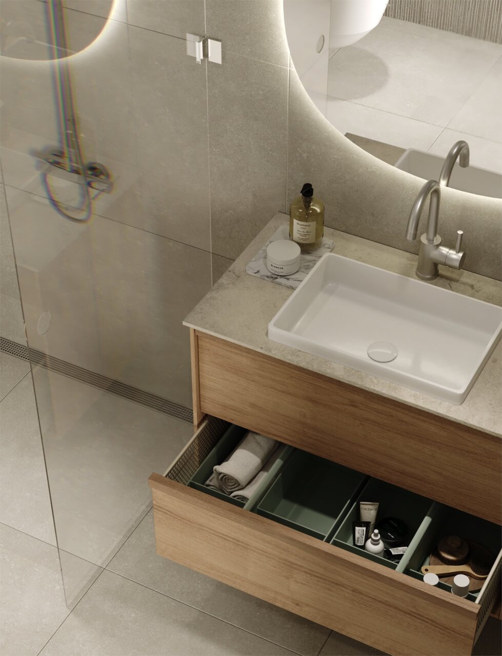 Bad leveres som prefabrikkerte badekabiner. Bad leveres med 60*60cm fliser på vegger og gulv, og 50*50cm i dusjsonen. Innredning i Eik-finish med heldekkende vask og speil med backlight belysning. Størrelse på baderomsinnredning og speil tilpasses de ulike baderomstypene.