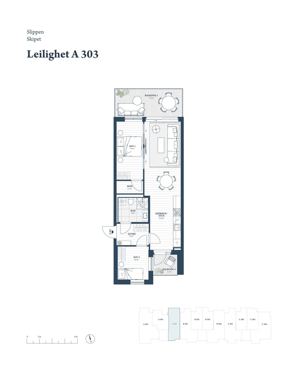 AA-303 er en gjennomgående 3-roms leilighet bliggende i 3. etasje. Leiligheten inneholder entré, to soverom og flislagt bad. Videre er det en gjennomgående, åpen stue-/kjøkkenløsning med utgang til balkong i begge ender. Fra stuen er det adkomst til hovedsoverom via to skyvedører, noe som sikrer maksimal plassutnyttelse.