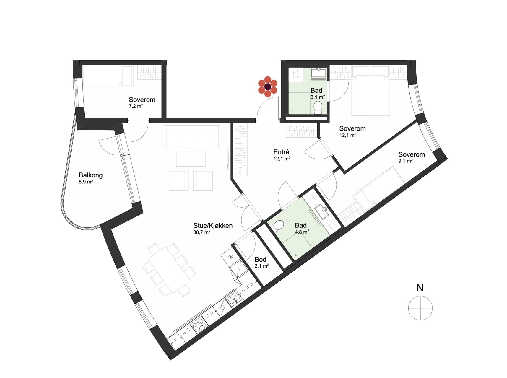 Her finner du gjennomtenkte selveierleiligheter fra 2-roms på 38 kvm til toppleilighet på 151 kvm, og selvsagt mange alternativer i mellom. Den enkelte leilighet er nøye planlagt med mål om å skape gode hjem. Planløsningene er gode og effektive med fokus på boligens hjerte, allrommet. Alle leiligheter leveres med et helhetlig interiørkonsept i nordisk stil. Blant annet leveres enstavs eikeparkett, gulvfliser i entré, massivdører, og kjøkken fra HTH med integrerte hvitevarer fra Miele. Ytterligere tilpasninger er mulig i tilvalgsprosessen.