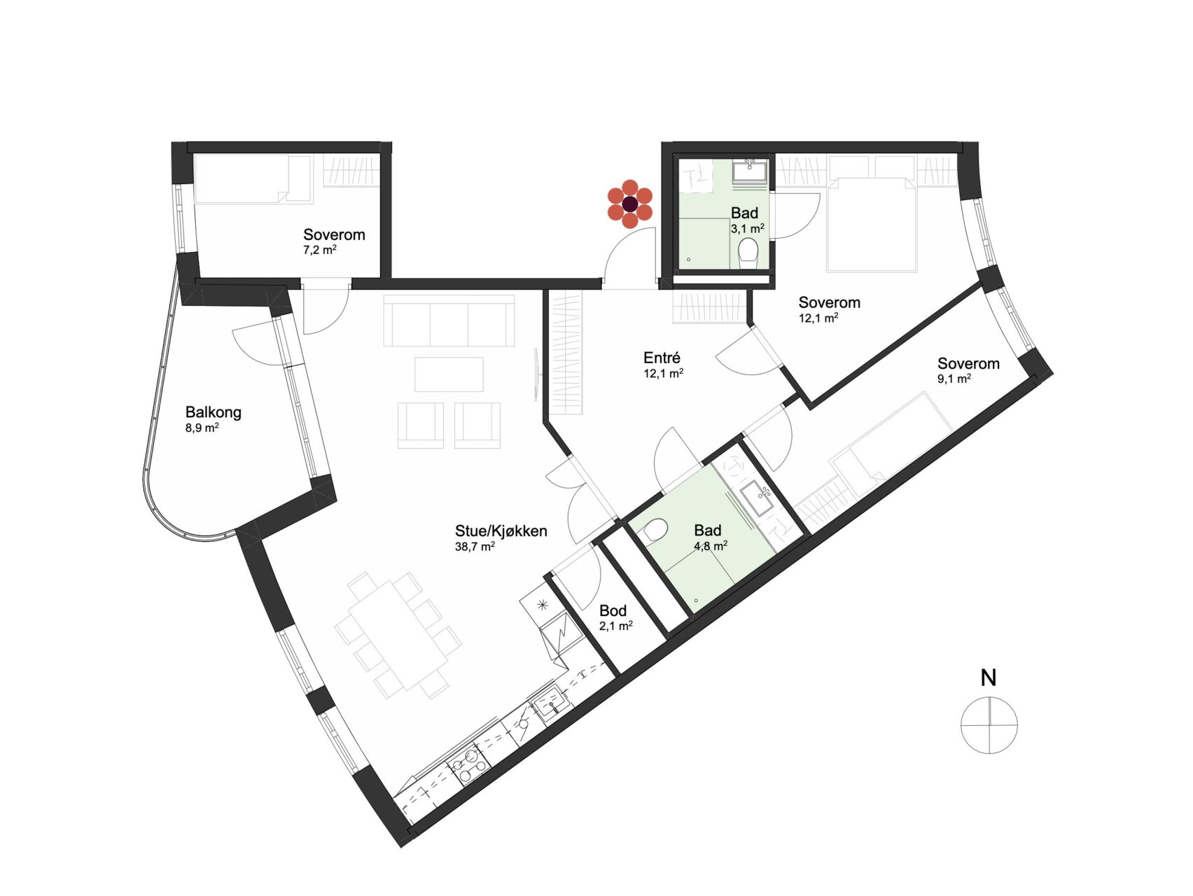 Tegninger og bilder i markedsføringsmateriell er kun illustrasjoner og kan avvike noe i forhold til plan – og fasadetegninger som vedlegges. Selger leverer ikke; innredninger, lamper, øvrig belysningsutstyr, markiser/solavskjerming, tepper, møbler og annet tilbehør, med mindre det fremgår av leveransebeskrivelse samt kontraktstegninger. 3D og VR-modellen er basert på skisser og regulert volum og kun ment som en illustrasjon.