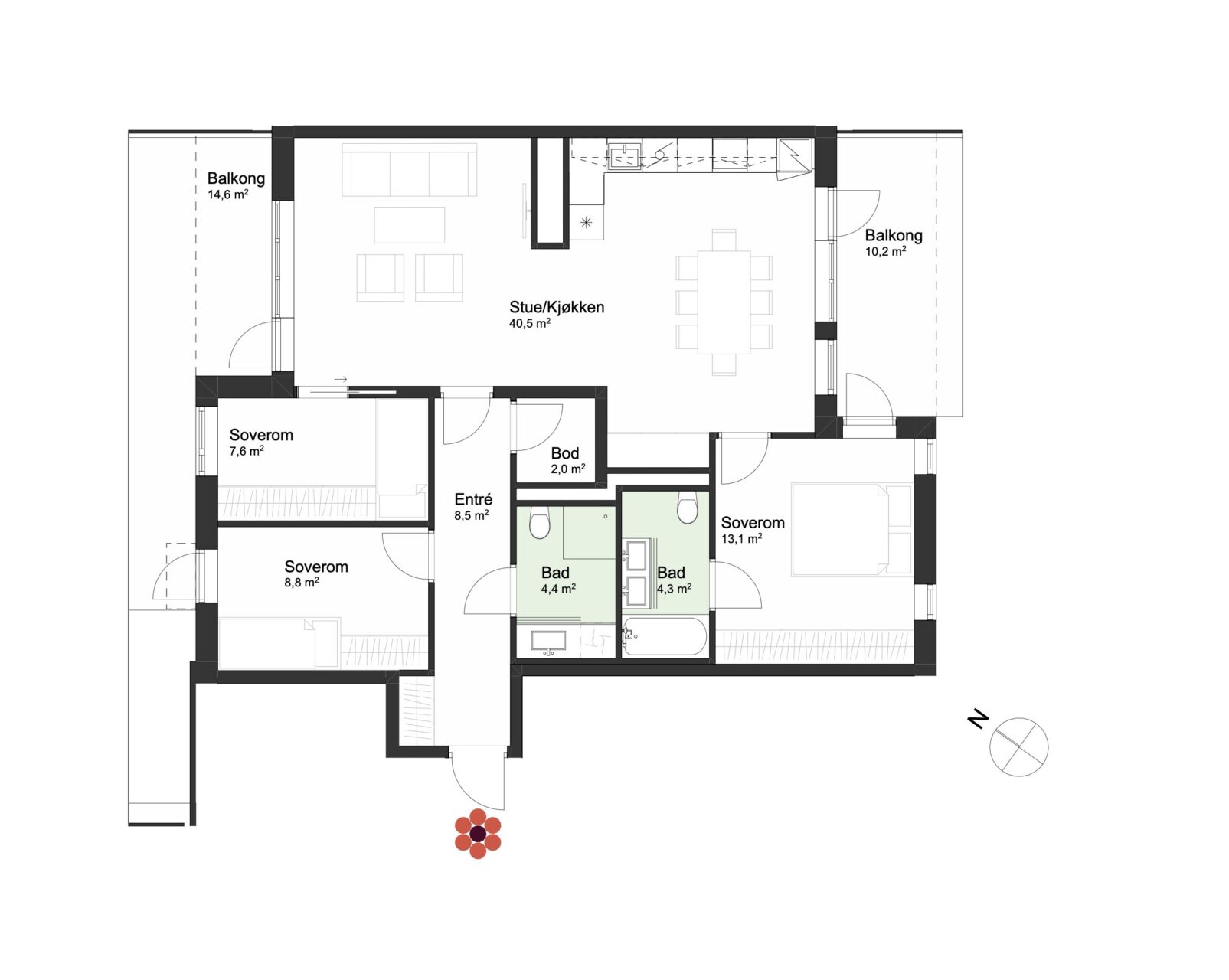 Her finner du gjennomtenkte selveierleiligheter fra 2-roms på 38 kvm til toppleilighet på 151 kvm, og selvsagt mange alternativer i mellom. Den enkelte leilighet er nøye planlagt med mål om å skape gode hjem. Planløsningene er gode og effektive med fokus på boligens hjerte, allrommet. Alle leiligheter leveres med et helhetlig interiørkonsept i nordisk stil. Blant annet leveres enstavs eikeparkett, gulvfliser i entré, massivdører, og kjøkken fra HTH med integrerte hvitevarer fra Miele. Ytterligere tilpasninger er mulig i tilvalgsprosessen.