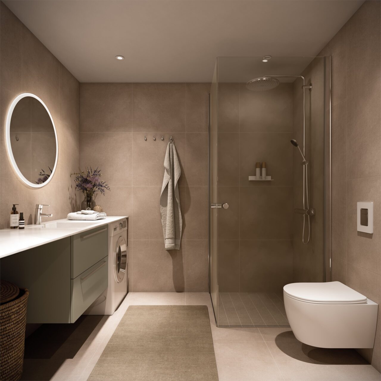 Badene leveres med storformats fliser. Innredning og fliser har lune og harmoniserte farger.