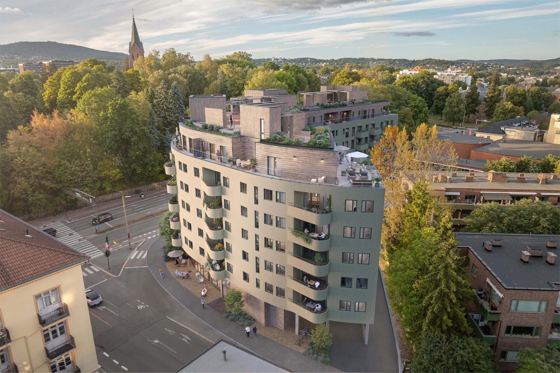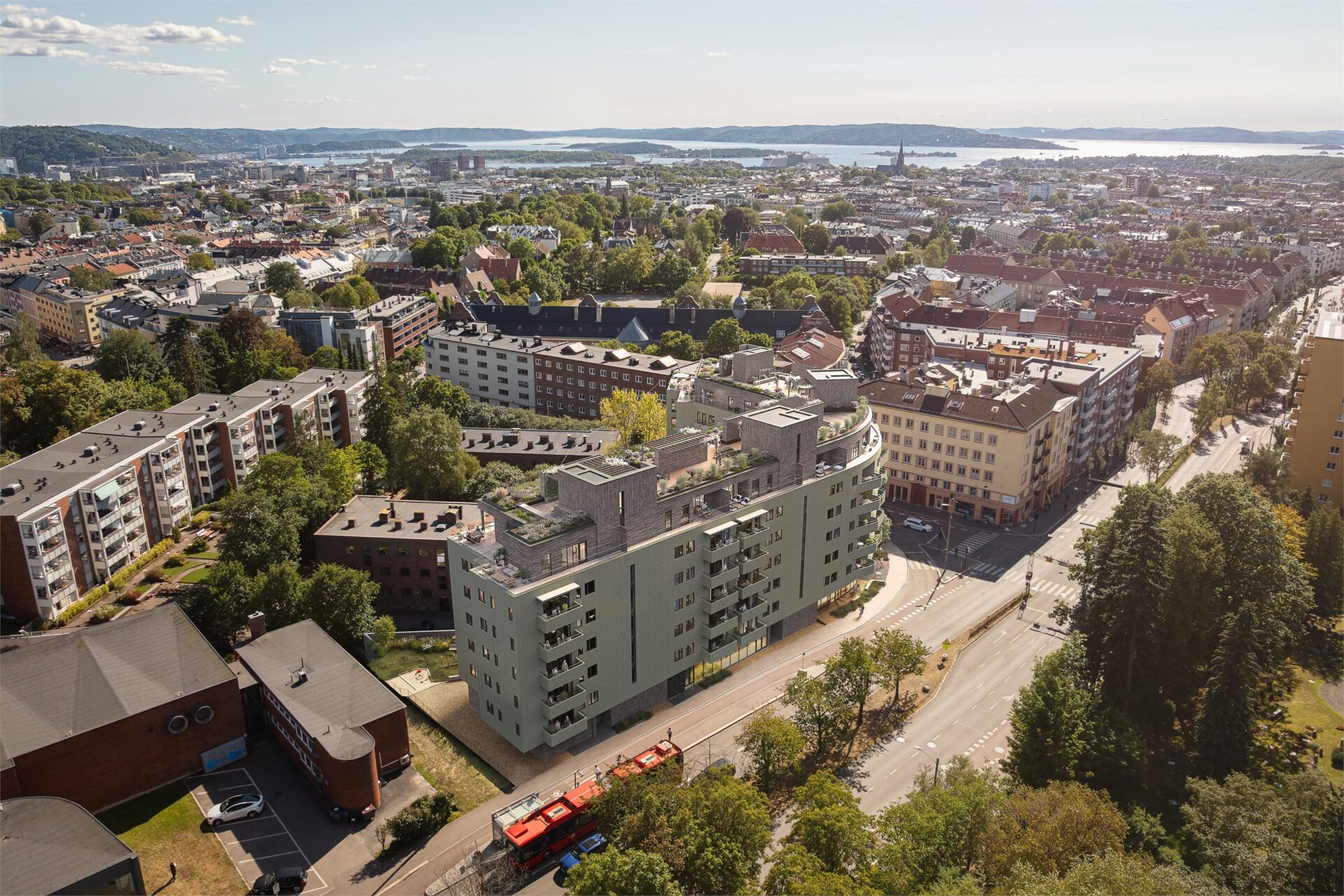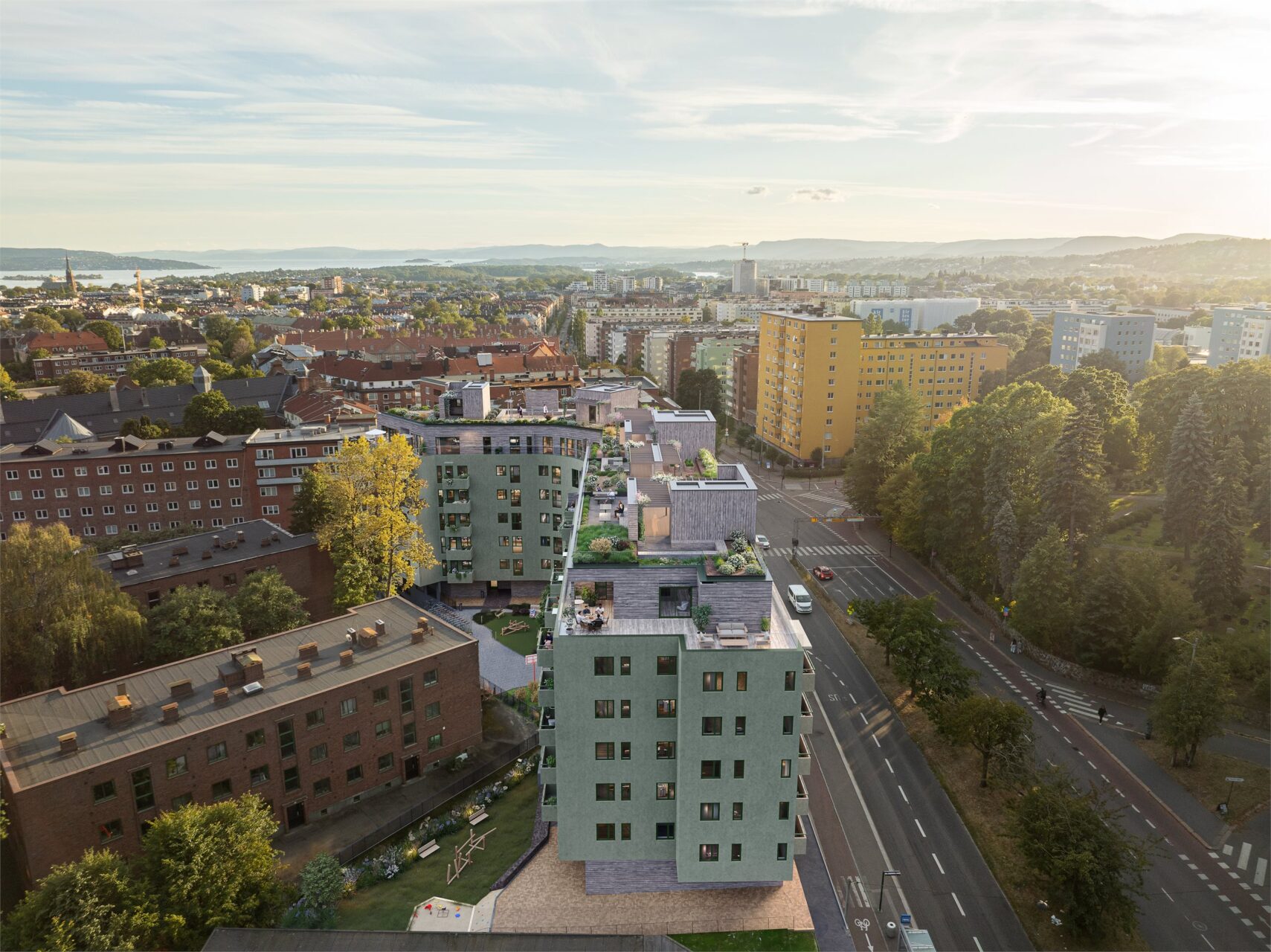 Uteområdene er utformet med tanke på bred soneinndeling. Bakgården er utformet med en liten aktivitetsplass og en sansehage, mens takterrassen har soner med utekjøkken, treningsapparater, dyrking og godt med sitteplasser. Fra den frodige takhagen har du utsikt nedover Fagerborg og mot Oslofjorden. Dette er et sted hvor du kan samle gode venner, eller trekke deg tilbake helt alene og nyte utsikten.
