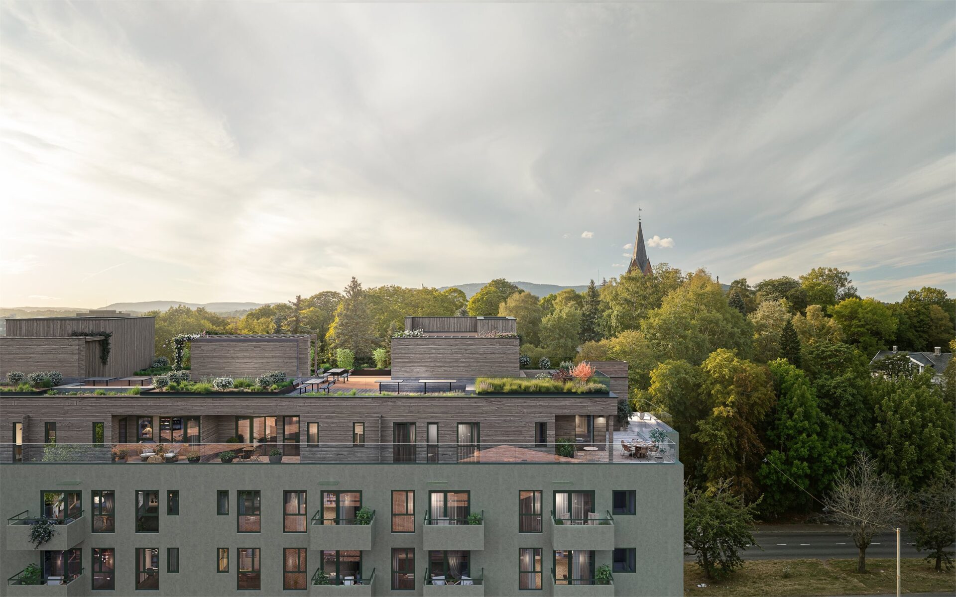 Det er utarbeidet utomhusplan for bakkeplan og takhage. Landskapsplanen er en illustrasjon av hvordan utomhusområdene er planlagt opparbeidet, med forbehold om tilpasning og endringer.