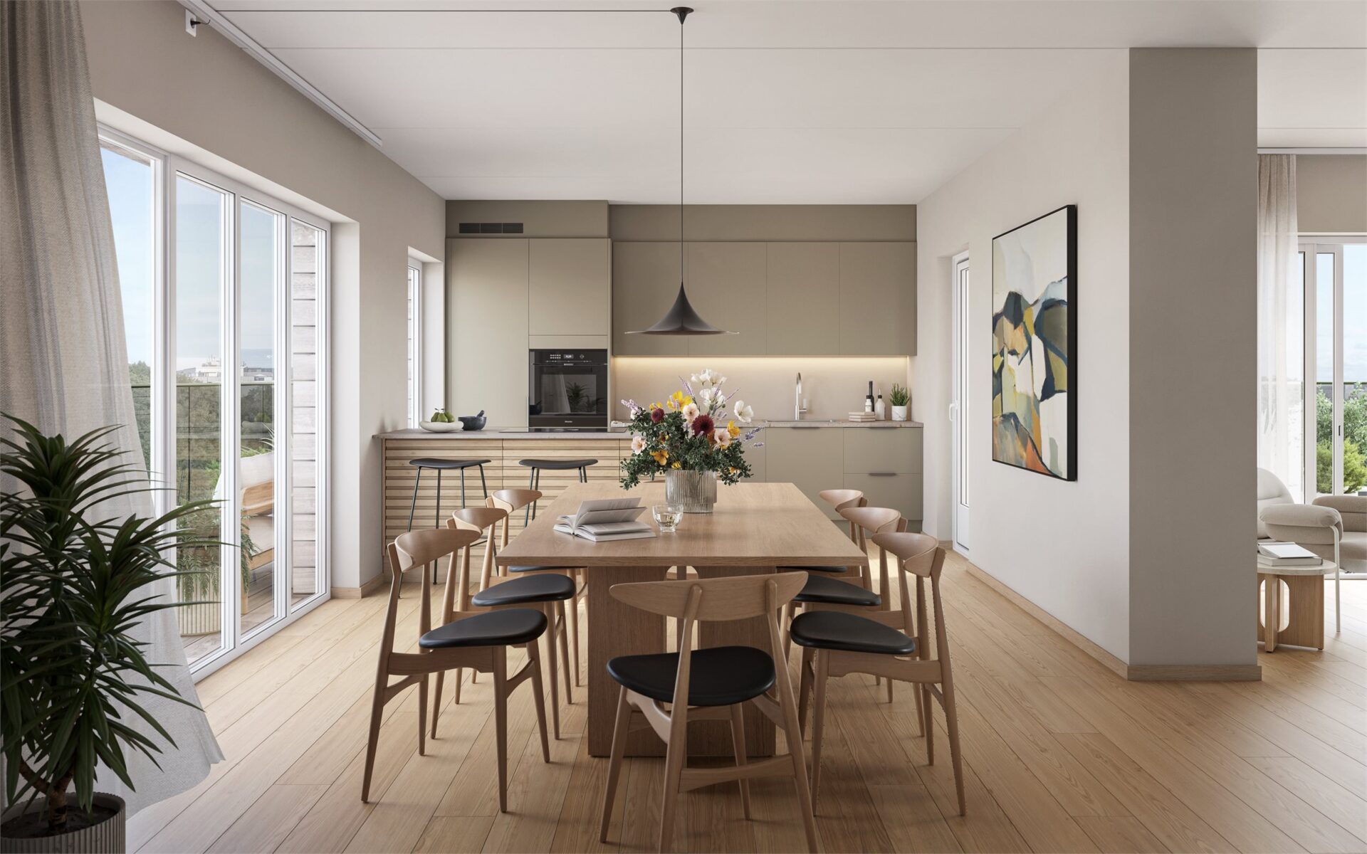 Paletten i interiøret er inspirert av den nordiske naturen, med lyse og duse jordfarger som skaper en tidløs og behagelig atmosfære – typisk for skandinavisk interiørdesign. Veggene i entre, gang, stue og kjøkken leveres i fargen Kalk, en lys gråbeige tone med et hint av rødt som gir en lun og innbydende følelse. Kjøkkenet leveres av HTH i fargen Leire som harmonerer godt med de øvrige fargene. Videre leveres det integrerte hvitevarer fra Miele.
