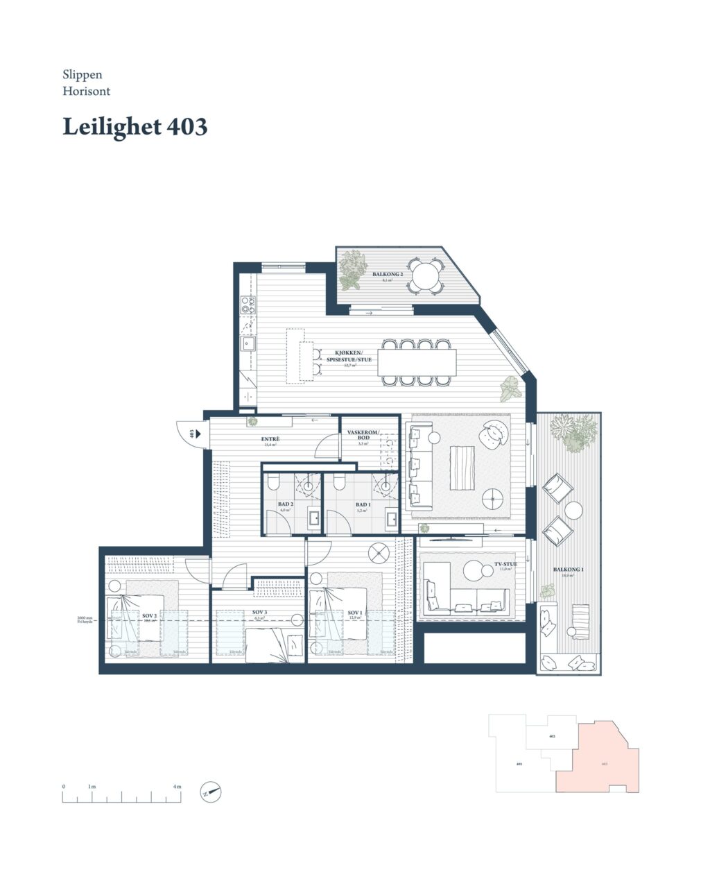E-403 er en flott 4-roms topp- og hjørneleilighet med vidstrakt fjordutsikt. Leiligheten har ekstra god takhøyde i stue og inneholder 3 soverom og 2 bad, hvorav ett av badene er direkte tilknyttet hovedsoverommet. I tillegg har man eget vaskerom. Videre finner man en stor og åpen stue-/kjøkkenløsning med kjøkkenøy og god plass for både langbord og sofagruppe. Fra stuen har man utgang til begge balkonger.