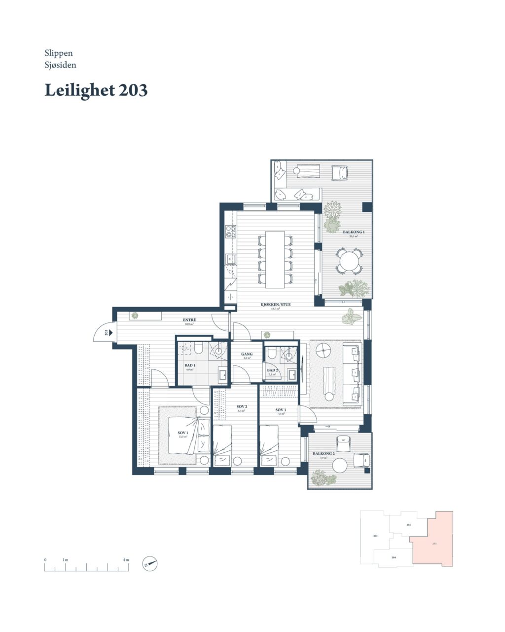 F-203 er en flott 4-roms endeleilighet. Leiligheten ligger i 2. etasje, men blir en 3. etasje mot vannet pga skrånet tomt. Leiligheten inneholder entré med plass for garderobeløsning. Den har tre soverom og to bad, hvorav ett av badene er direkte tilknyttet hovedsoverommet. Videre er det en åpen stue-/kjøkkenløsning med plass for både spisebord og sofagruppe. Fra stuen har man utgang til begge balkonger, hvorav særlig den ene byr på vidstrakt fjordutsikt.