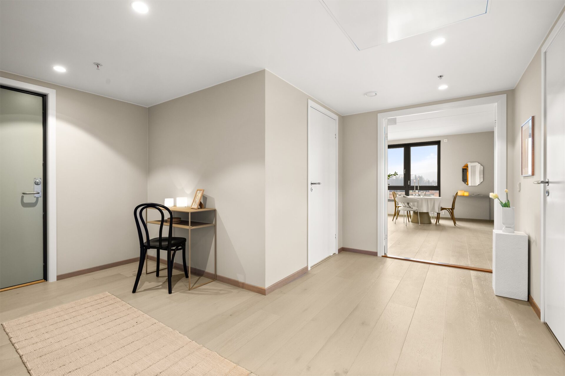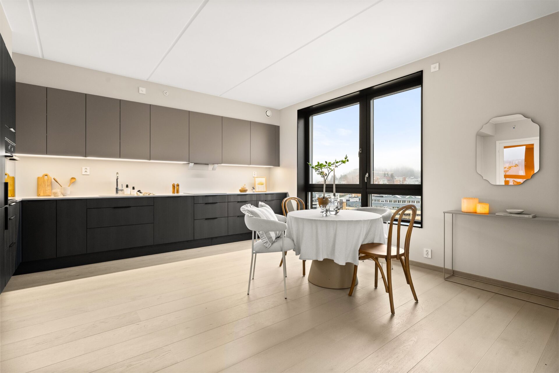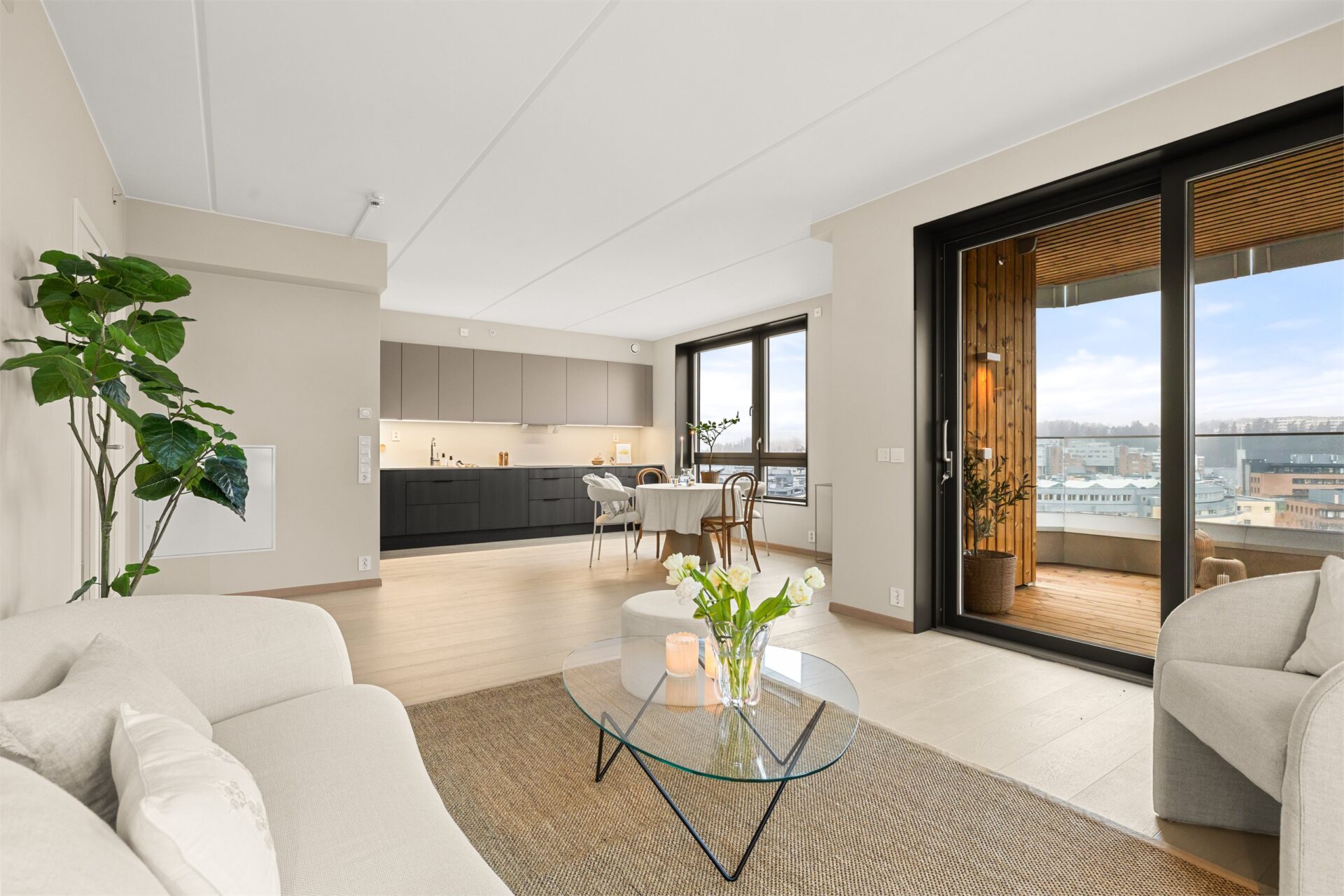 Alle leilighetene ligger høyt over bygulvet, og flere med fjordutsikt. Her kan du finne deg en bolig du aldri har sett maken til tidligere, med en kvalitet på materialer og finisher du vil nyte å ha rundt deg. Samtlige leiligheter får egen uteplass, tilgang til felles takhage i 6. etasje og felles takterrasse i 14. etasje.