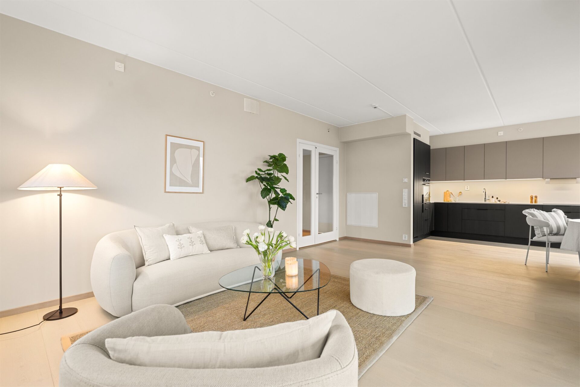 Dette er en lekker 4-roms endeleilighet beliggenhet mot vest. Leiligheten har en innholdsrik planløsning med romslig entré, 3 soverom og 2 delikate bad. Videre har man en åpen stue-/ kjøkkenløsning på 38 kvm med gode møbleringsmuligheter i ulike soner. Fra stuen er det utgang til vestvendt balkong med gode solforhold og flott utsikt mot Sandvika.
