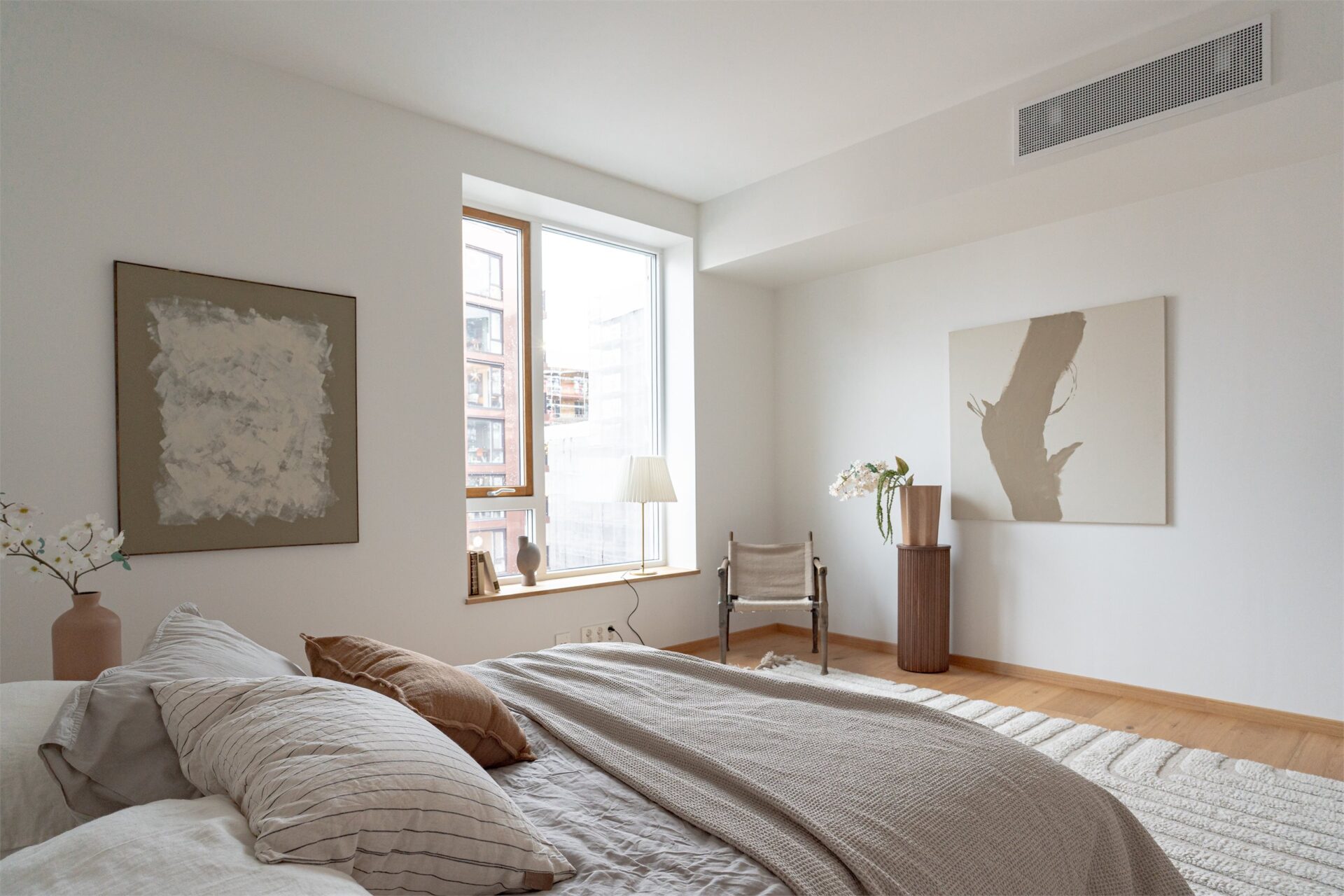 Balansert ventilasjon fra eget luftbehandlingsanlegg i hver enkelt leilighet. Luftbehandlingsanlegg er plassert i bod, egen nisje eller over himling. Behandlet friskluft tilføres i stue og soverom. Avtrekk vil være fra bad, boder og kjøkken.
