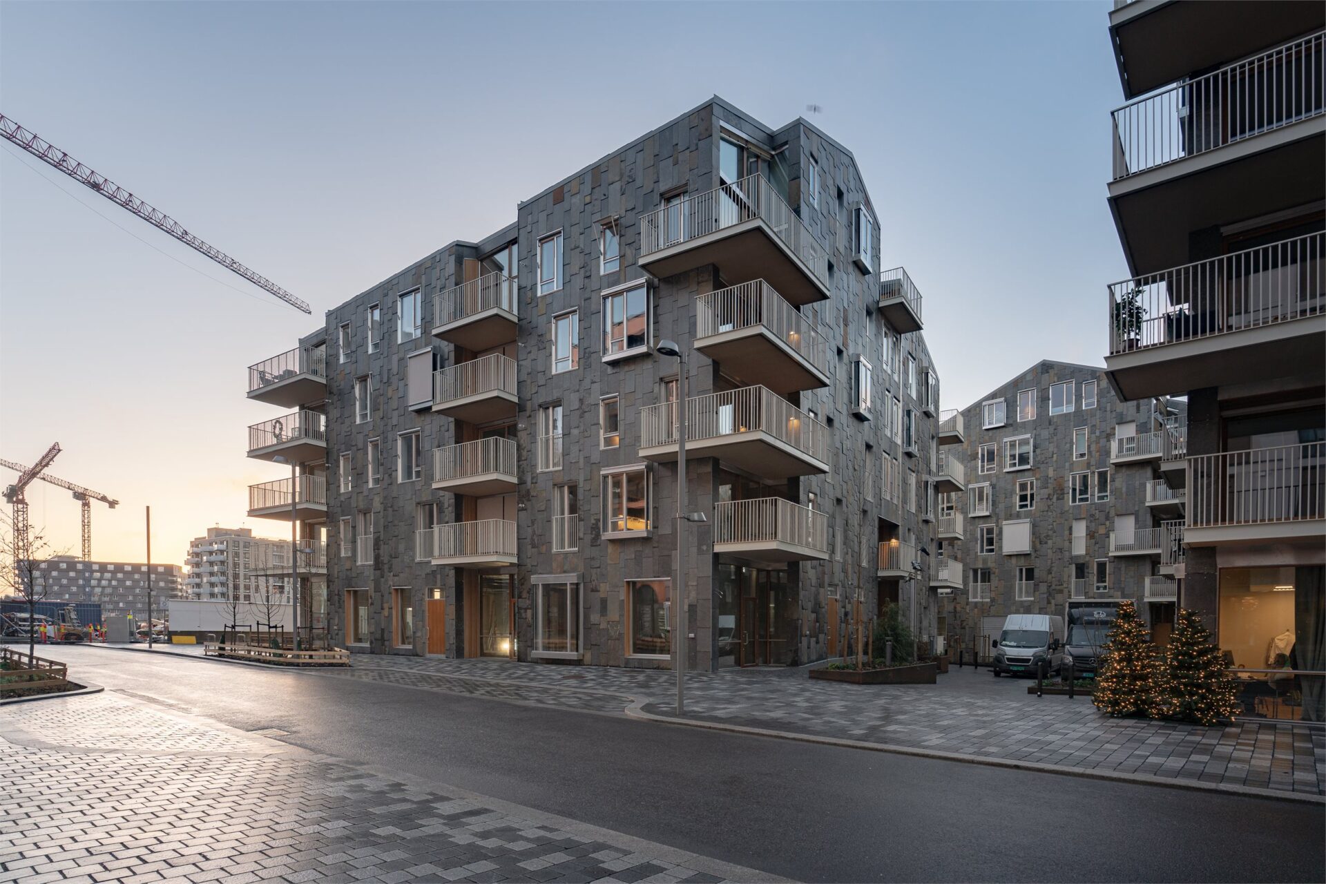De fem punkthusene er bygget ut i sjøen, og fjorden ledes inn mellom husene. Vannspeil, smale broer og kanaler gir en intim stemning og maritim opplevelse.