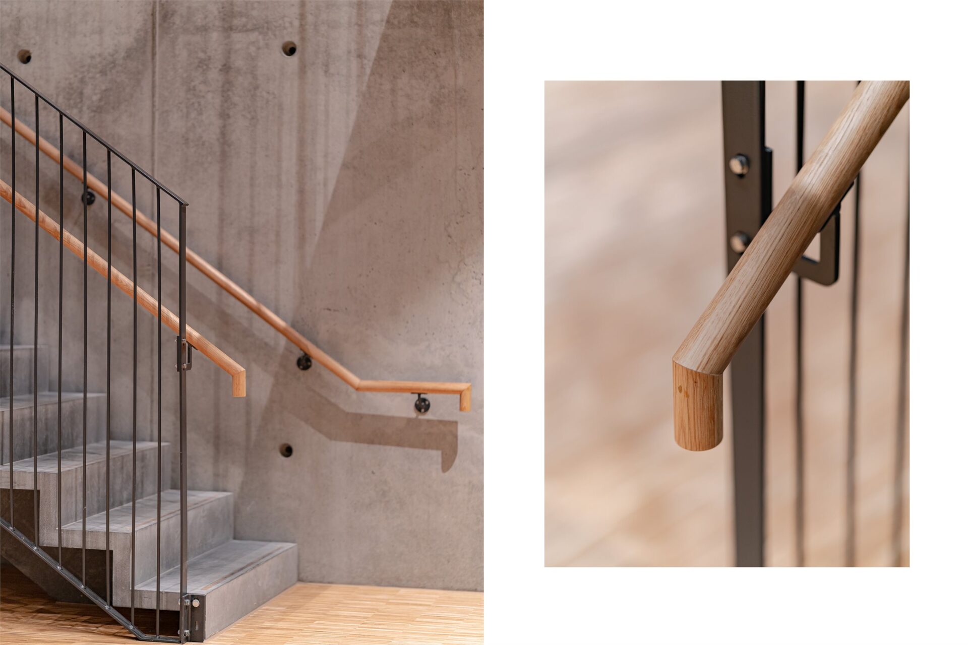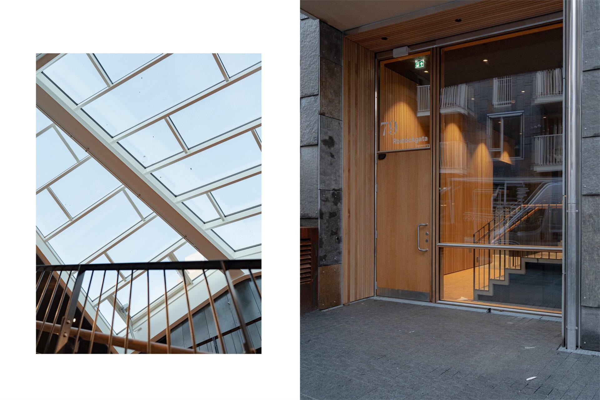 Veggene i trapperommet utføres som rå betongelementvegger med synlige fuger. Veggen rundt heis kles i mørke råstålplater. Gulvoverflatene på trapper leveres i betong med overflatebehandling/støvbinding. Rekkverkene leveres i sortlakkert stål med håndløper i massiv eik. På gulv på etasjereposer leveres høykantparkett i eik. Himlingen på reposer leveres som i inngangspartiene med sorte treullsementplater med fin struktur. Synlige betonghimlinger vil ha preg av fuger i møter mellom betongelementene. Inngangsdører leveres malt.