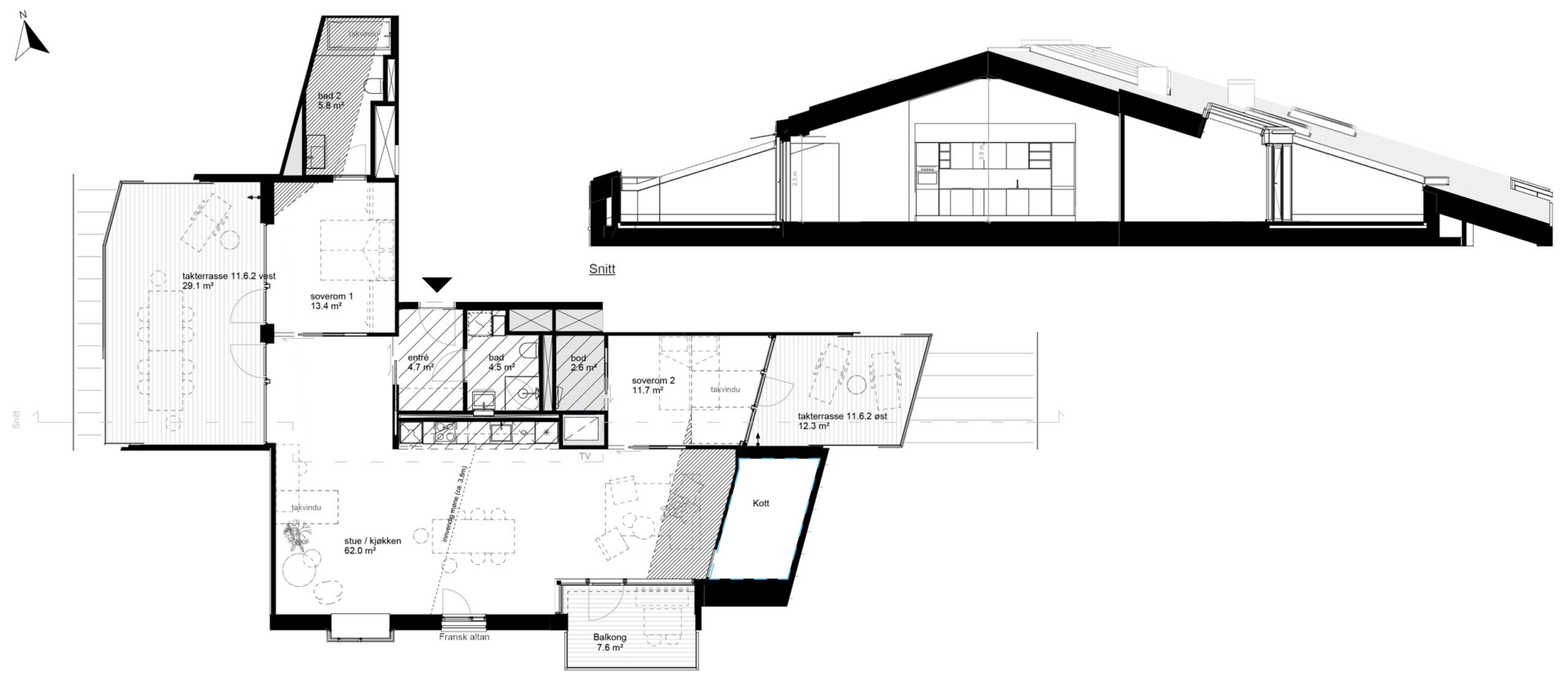 11.6.2 er en rålekker 3-roms toppleilighet for den som er ute etter noe ekstraordinært. Fra entré, med plass til garderobeløsning, har du adkomst til boligens ene bad. Så ledes du inn til en særdeles luftig og stor åpen stue- og kjøkkenløsning. Det er skråtak med innvendig mønehøyde på 3,8 m. I stuen har man flere flotte detaljer som: takvindu, innvendig sittekarnapp og fransk balkong. Boligen har to lekre soverom av god størrelse. Hovedsoverom er 13,4 kvm og har adkomst til privat bad med takvindu , samt plass til garderobeløsning. Soverom 2 er 11,7 kvm med takvindu og utgang til privat takterrasse på ca 12,3 kvm, samt adkomst til innvendig bod. Boligen har 3 uteplasser. I tillegg til takterrassen med adkomst fra soverom 2 har man en sydvendt balkong på 7,6 kvm ut fra stuen. Det ligger i tillegg er fantastisk privat takterrasse mot vest med adkomst både fra stuen og fra hovedsoverom. Her kan man nyte sene solnedganger og flott utsikt mot sjøen.