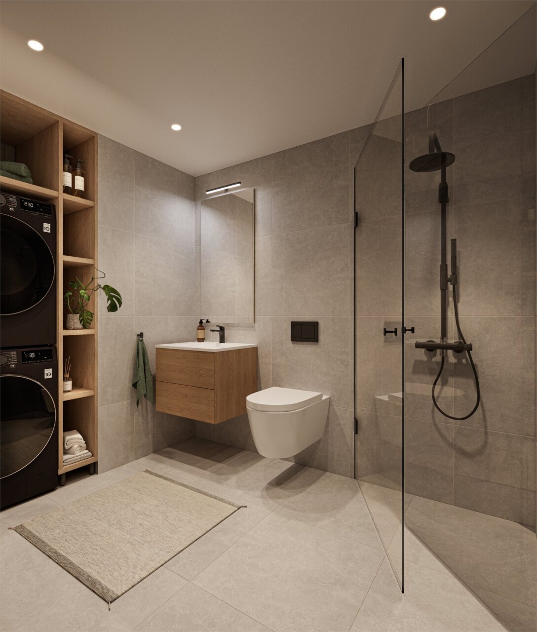 Det leveres baderomsinnredning med omfang iht. kontraktstegning og innredning iht. romskjema. Heldekkende servant med ettgreps blandebatteri og pop-up ventil. Veggmontert toalett med innebygget sisterne og toalettsete med soft-close. Speil og belysning over vask. Fordelerskap plasseres bak speilet over servant. Det leveres dusjvegg i klart glass og hjørnesluk. Det leveres jevnt fall mot sluk på hele badet og derfor ikke nedsenk ved dusj. Kjøper vil derfor kunne forvente noe vannansamling utenfor dusjvegg ved bruk. Innfelte downlights i himling med dimmefunksjon. Antall tilpasses badets størrelse.