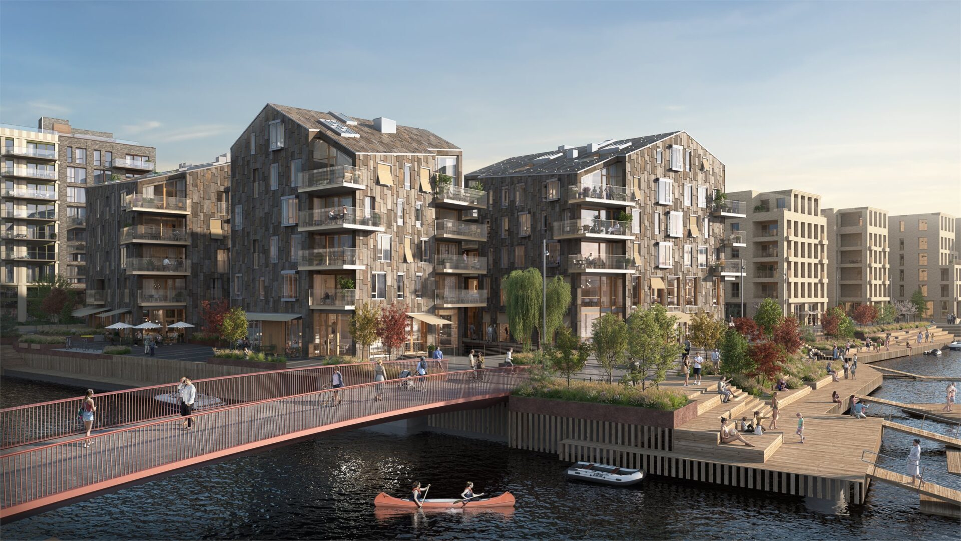 De fem punkthusene er bygget ut i sjøen, og fjorden ledes inn mellom husene. Vannspeil, smale broer og kanaler gir en intim stemning og maritim opplevelse.