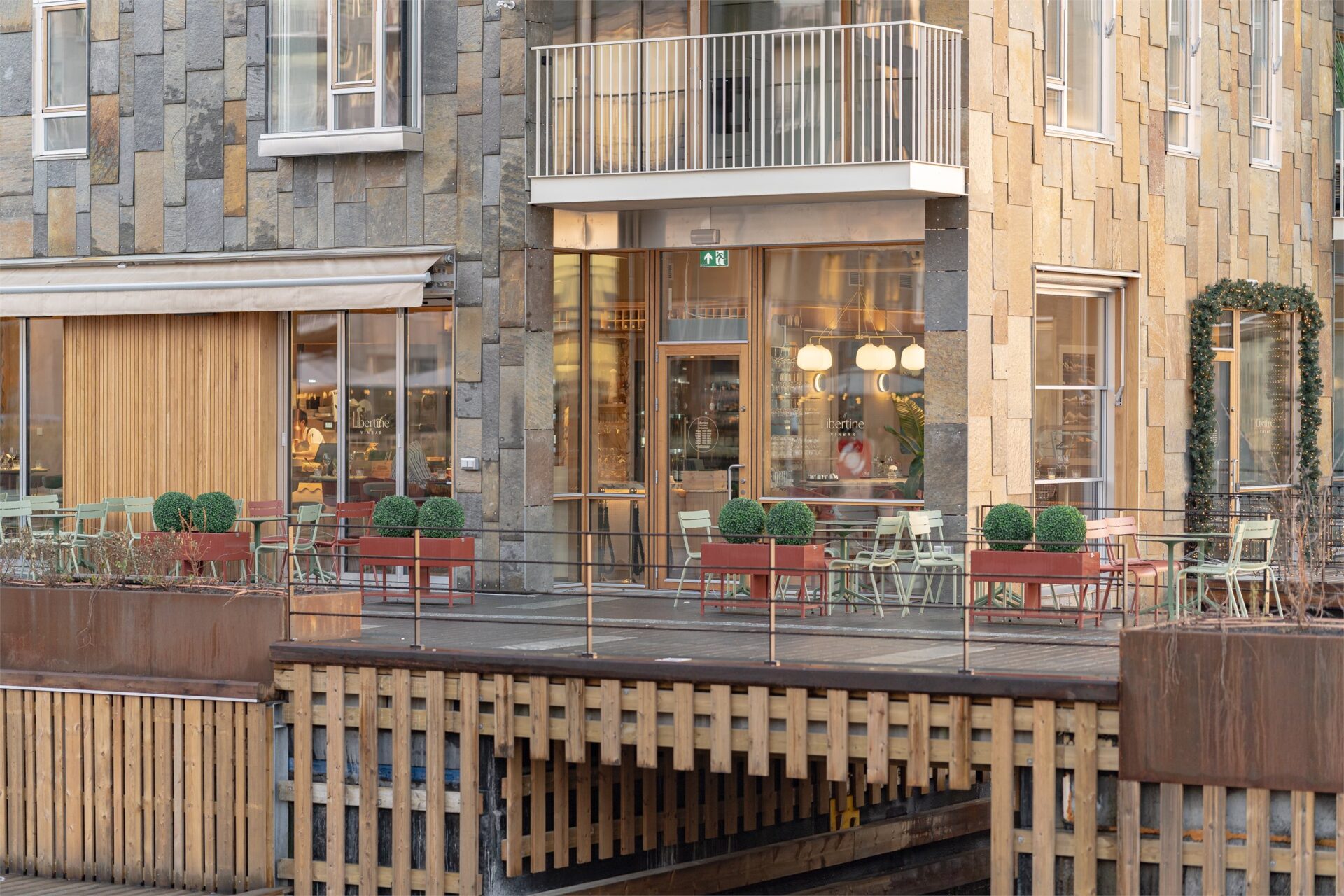 Takterrasser er «skåret» inn i taket for å danne le og gi utsikt. Disse leveres med tremmegulv i tre, spilevegg i tre på vegg og glassrekkverk. På grunn av værbelastning vil det kunne forventes patinering og sprekkdannelser i treverket på terrassen. På takterrassene gjøres det oppmerksom på at kjøper står ansvarlig for rens av sluk.